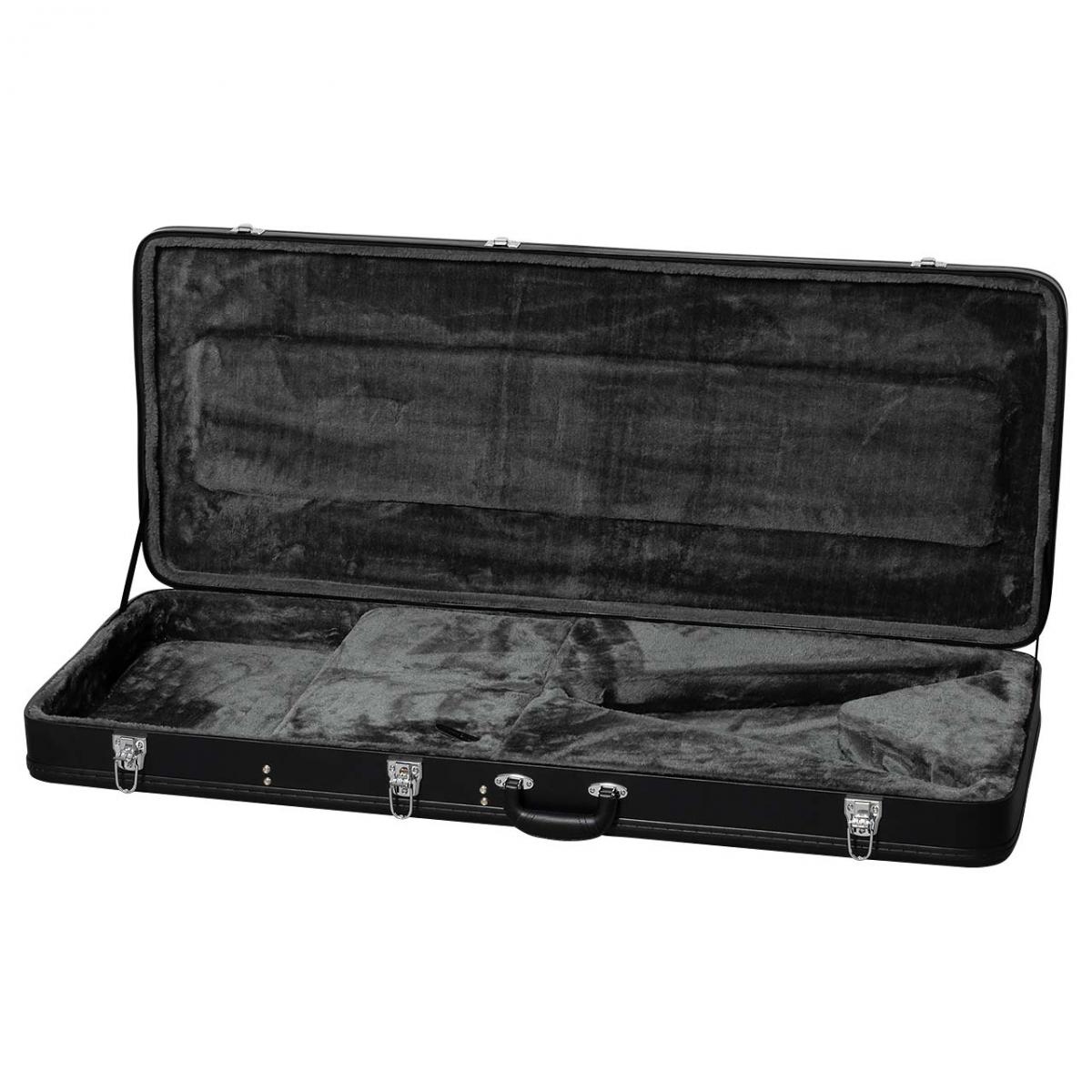 ヘビーメタルを想起させるルックスには、精悍な印象を与えるブラックメタリック・フィニッシュとギター全体に施されたホワイトバインディングの絶妙なコントラストが一役買っています。