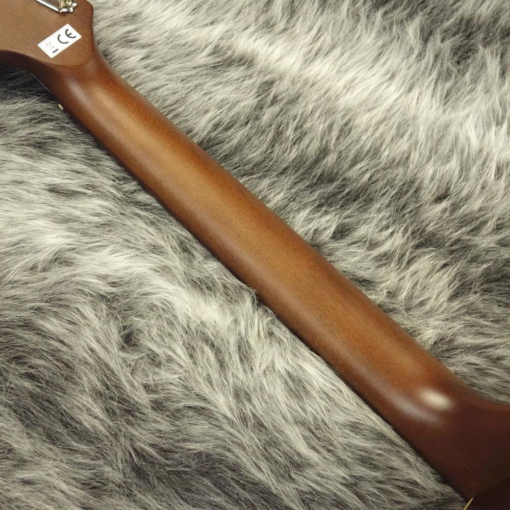ストラトヘッドのショートスケール(弦長612mm)マホガニーネックにウォルナット指板という仕様。