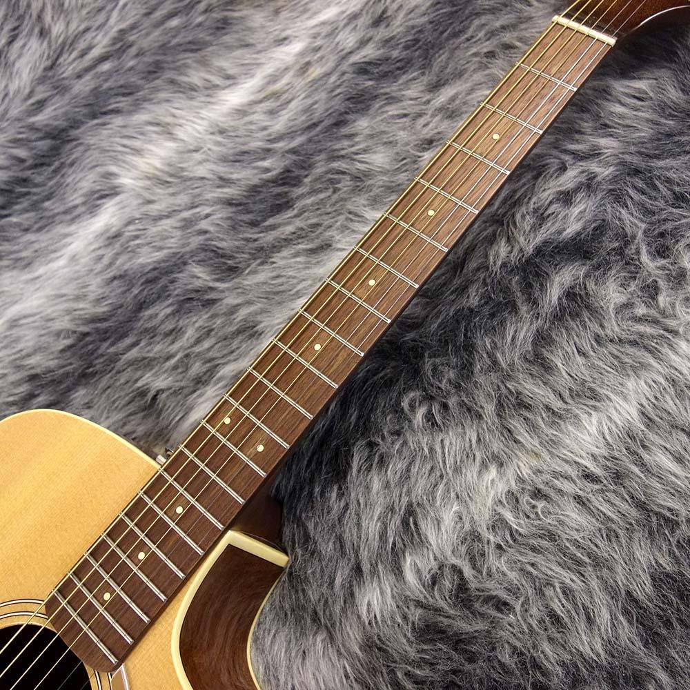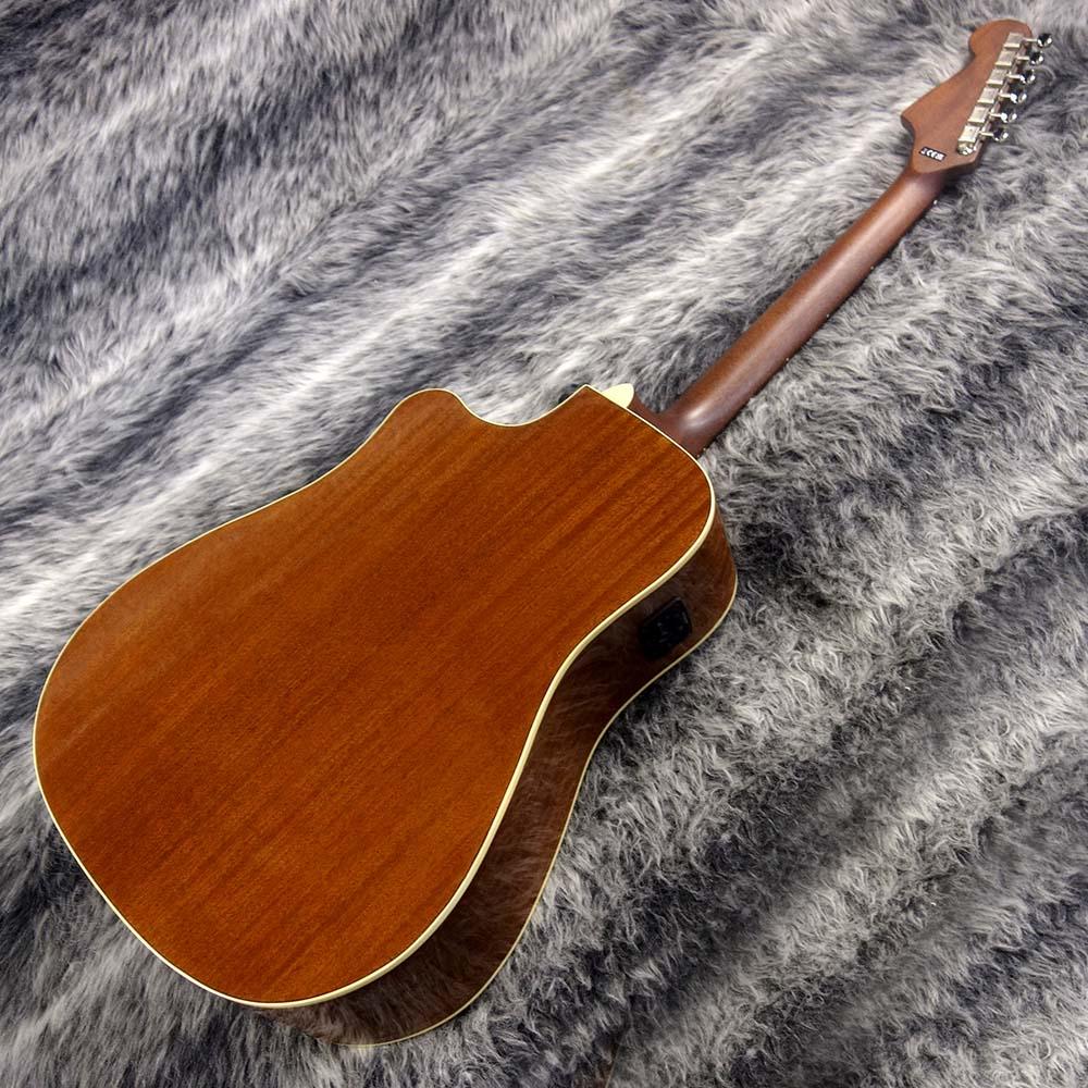 独自のスロープショルダーを持つ大振りなサイズのボディはボディはトップにスプルース単板、サイド&バックにマホガニーを使用したカッタウェイデザイン。