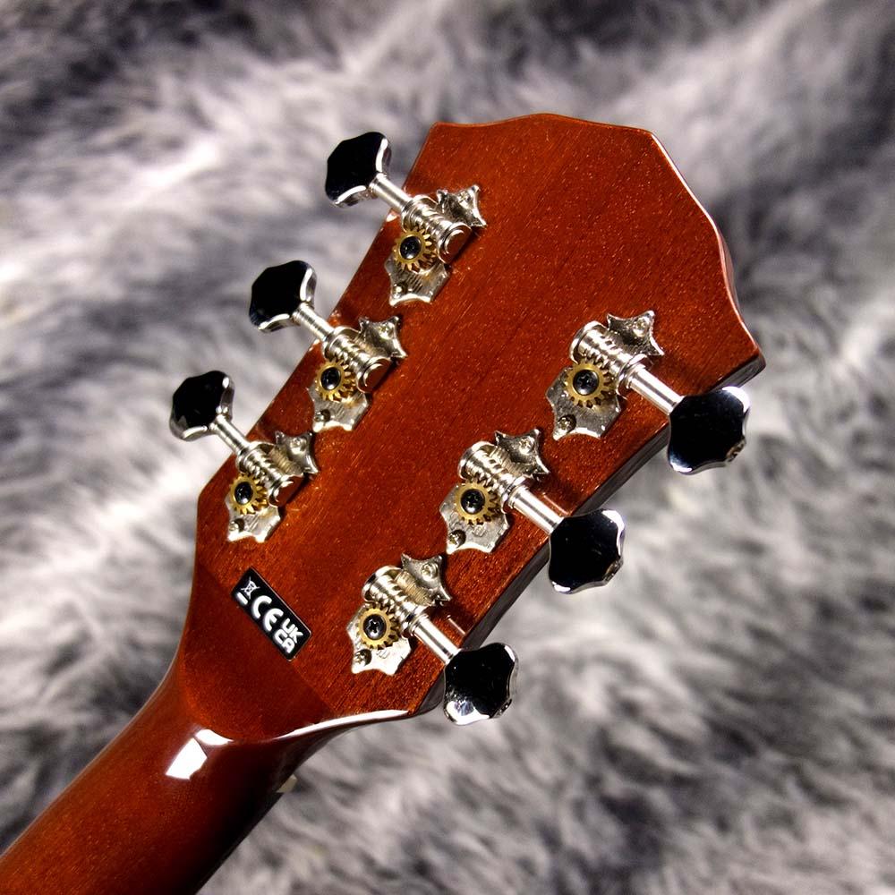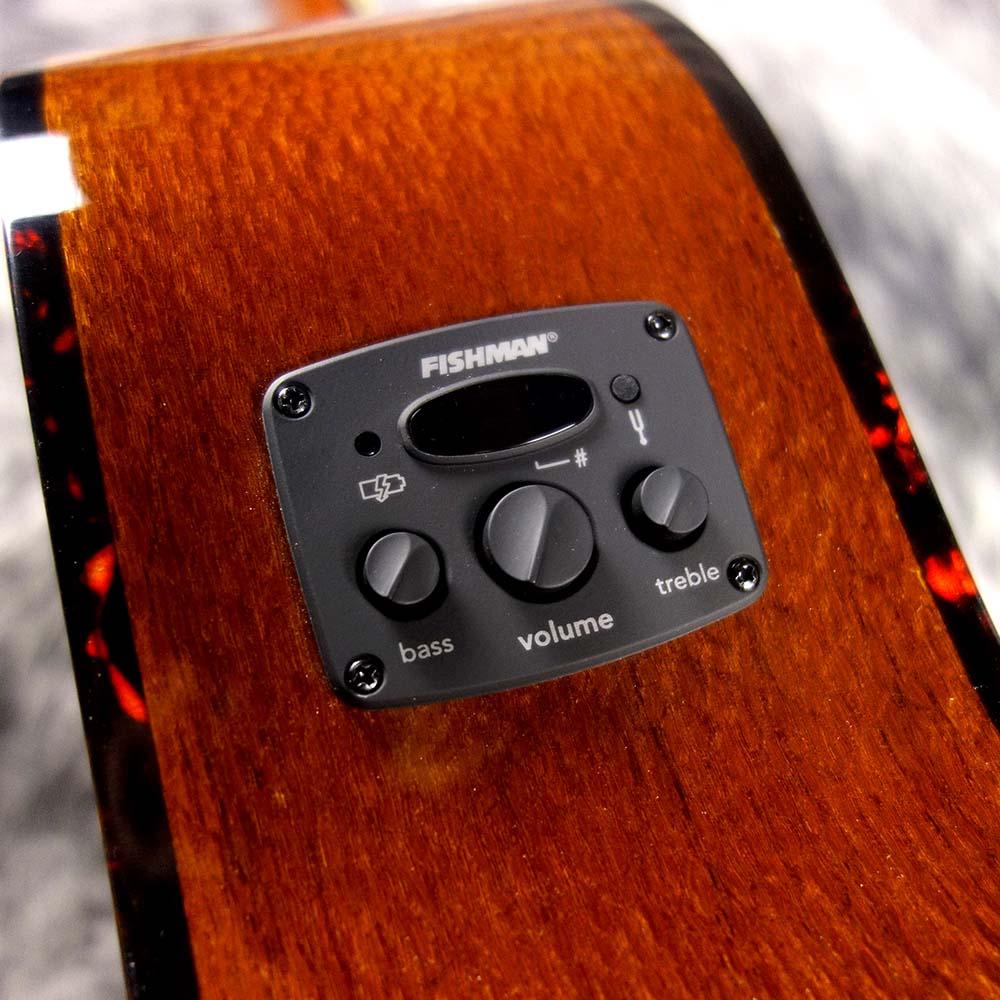 Fishmanのピックアップシステムを搭載したエレアコ仕様で、チューナー機能や2バンドEQなどを備えた使い勝手の良い一本です。