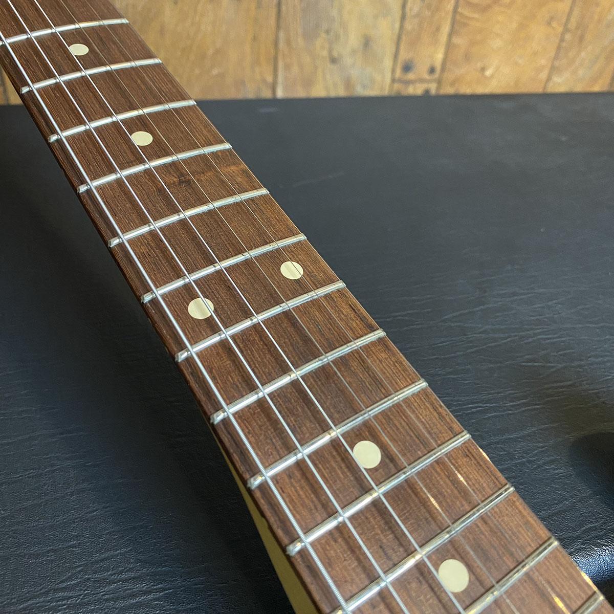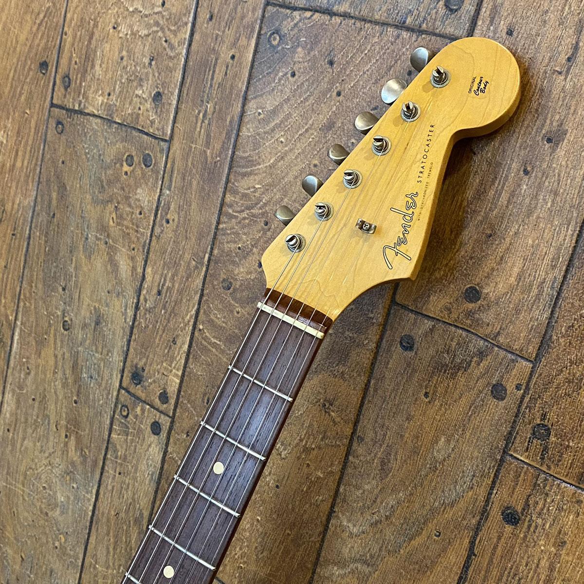 ファットなサウンドで人気の高い年式のストラトキャスターをフューチャーした本器はアルダーボディにメイプルネック、スラブ貼りのローズウッド指板という定番のウッドマテリアル。