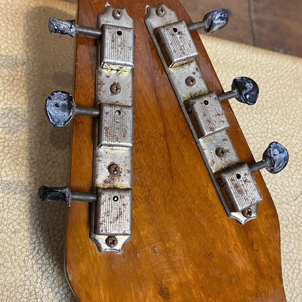 惜しいことにヘッドのレイズドロゴは欠損していますがピックアップ、ポット、ノブ、ペグ等主要パーツが残っている点は非常に嬉しいですね。