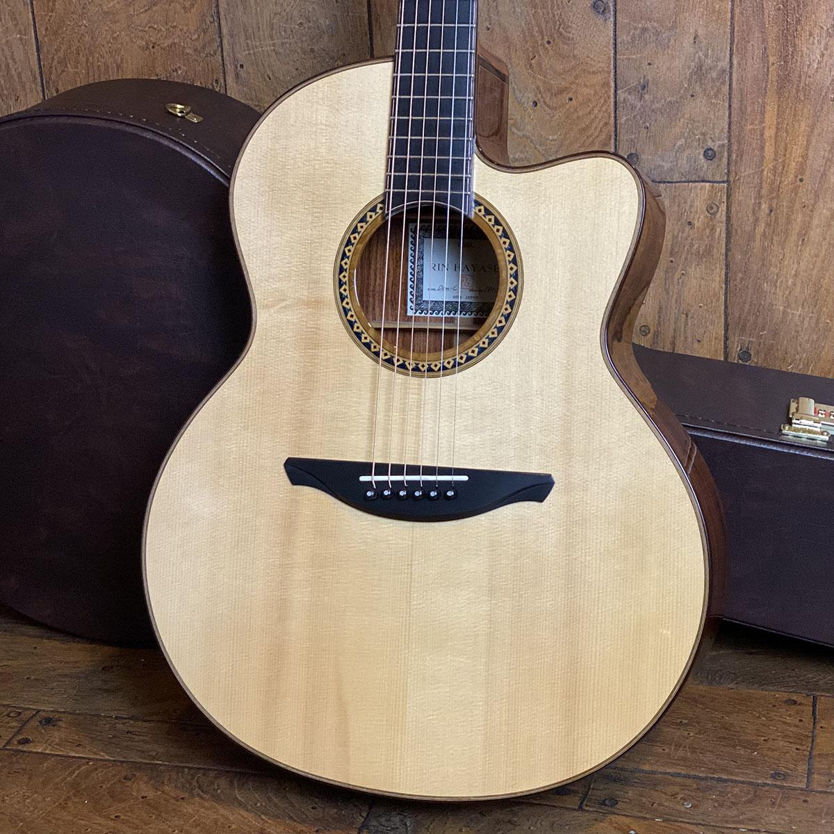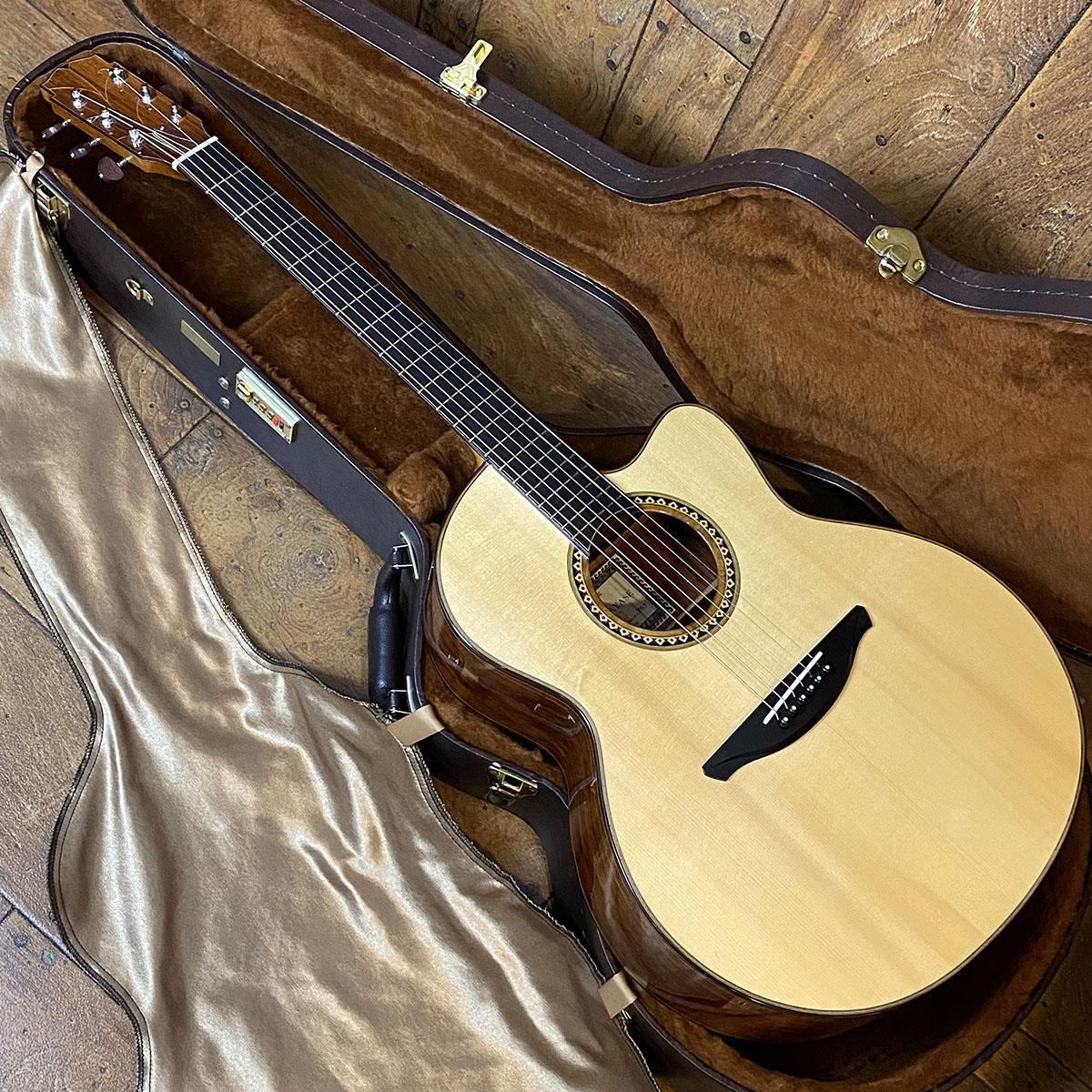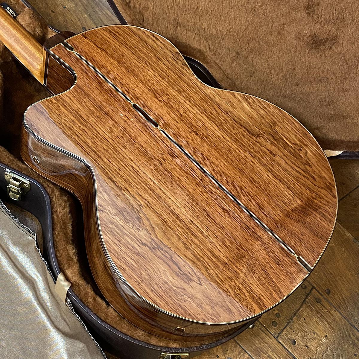 ボディトップにヨーロピアンスプルース、サイド&バックに貴重なホンジュラスローズウッドを使用したカッタウェイボディ。
