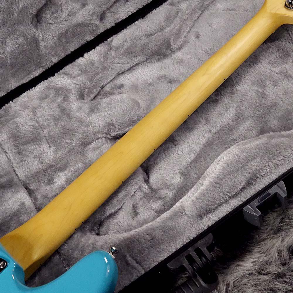こちらのマイアミブルーフィニッシュのモデルはボディ材にアルダー、指板材にはメイプルを使用しています。