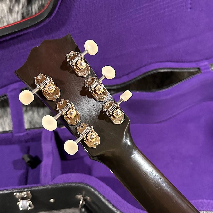 何気なく第一ポジションのコードを爪弾いたりブルーズの定石フレーズを弾くだけで、サザン・ジャンボの汎用性の高さをご納得いただけるでしょう。ヘッドストック上で“Only a Gibson is Good Enough”と書かれたバナーを誇らしく掲げつつ、オープン・スロット・ブリッジ、ボーン・サドル(ナット)、1.77インチと幅広なナット幅など、往年の仕様の数々が採用されており、本モデルの魅力が一層高められています。