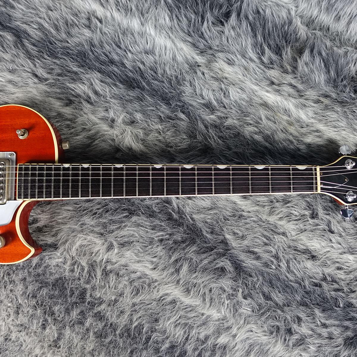 Gretsch Roc Jetを意識して作られた一本。0フレットの採用や、特徴的なヘッドシェイプ、各部に入れられたGretschライクなロゴ、メタルノブに彫られたGアローのようなマークなど、さまざまな箇所に魅力を感じます。