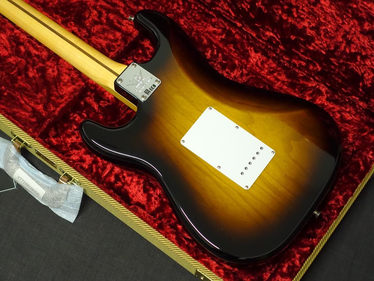 1-plyホワイトピックガードとシリアルナンバー入りバックプレート、1954年スタイルのABS製ホワイトピックアップカバーとコントロールノブ、カスタムショップ製ヴィンテージシンクロナイズドトレモロ、ヴィンテージスタイルチューニングマシン、ディスクストリングツリー、特別な70th Anniversary Stratocasterネックプレートといったプレミアムな仕様を備えています。