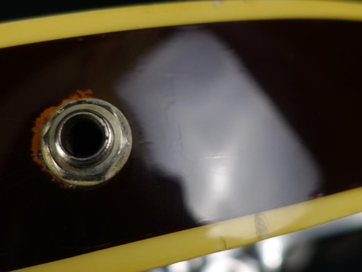 目立った部分では指板バインディングのひび割れ、ボディトップの1弦側ネックジョイント部~1弦側ホーン部にかけてバインディングの剥がれ、ジャック近辺の木部破損のタッチアップ跡が見受けられるなど、製造から45年近く経過している事を物語る貫禄あるコンディション。