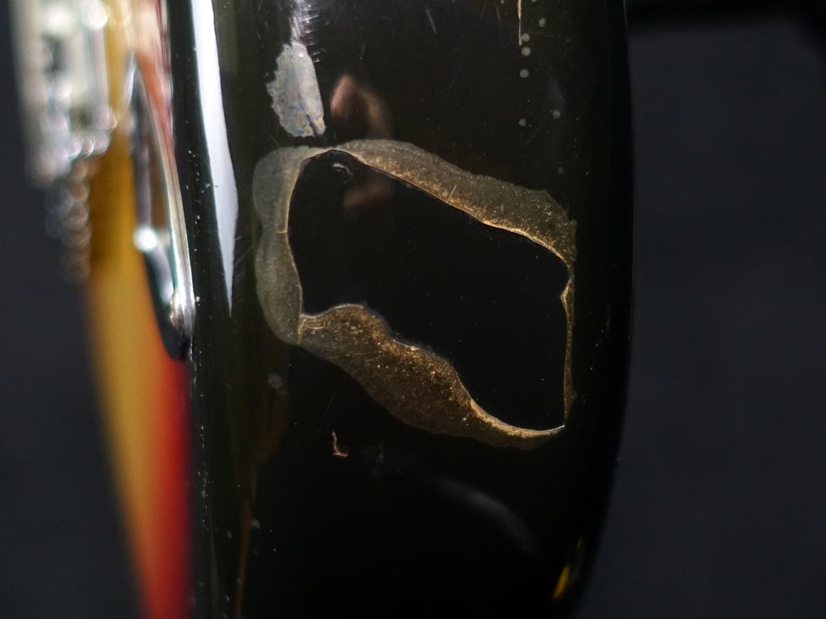 指板上に使用に伴う指板凹みが複数箇所確認できます。また上部のエンドピン穴が補修されております。