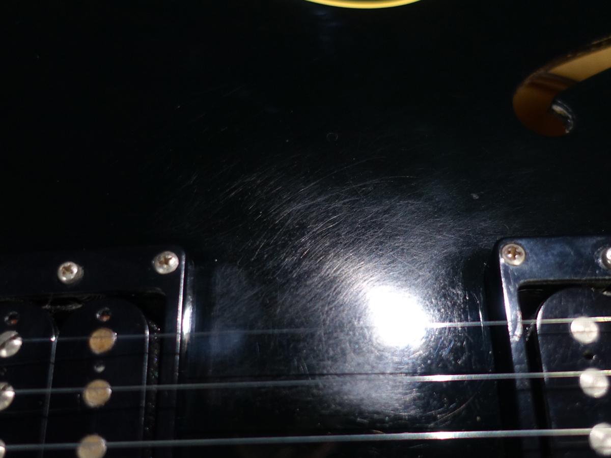 目立つ箇所でボディバック下部に木部の露出を伴う7mm程の打痕を始めポツポツと打痕が複数箇所見受けられる他、トーンノブにヒビが見受けられます。
