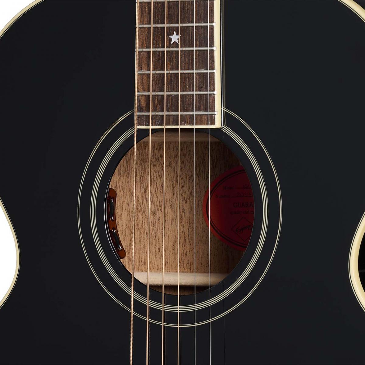 Epiphone J-180 LS には、サーマリーエイジド処理の施されたソリッドスプルース・トップ、スキャロップトXブレーシング、ソリッド・バック/サイド、25.5インチ・スケールのワンピース・ネック、Cネック・プロファイル、ローレル指板、そしてJ-180モデルの象徴ともいえるマザーオブパールによる“スター・インレイ”等、プレミアムな仕様が満載です。