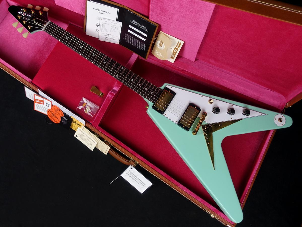 ギター全体ににKerry Greenカラーを採用した"Gibson Custom Shop 1958 Korina Flying V Reissue VOS Kerry Green White Pickguard GH"を弊社スタッフが現地ファクトリーでゲットして参りました。