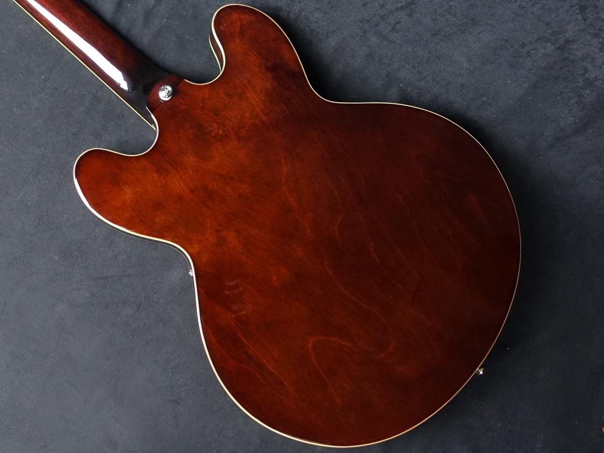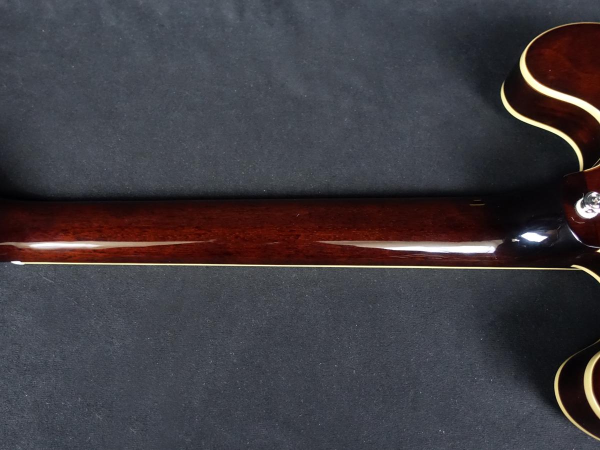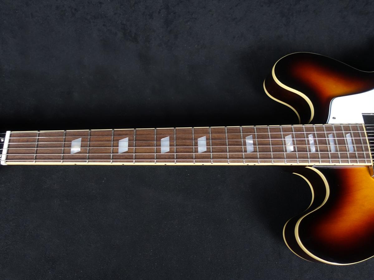 薄めのボディで一見セミアコに見えますが、センターブロックのないフルアコ構造で箱鳴り感が強いサウンドです。