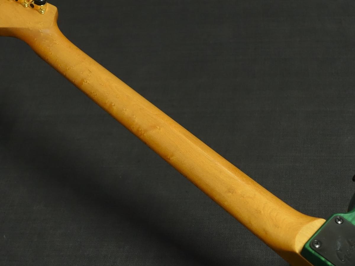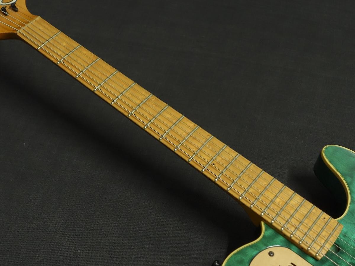 ボディトップはキルトメイプル、ボディバックには虎目のフィギュアドメイプルが贅沢に使用され、杢目を生かした鮮やかなシースルーグリーンカラーで仕上げられています。