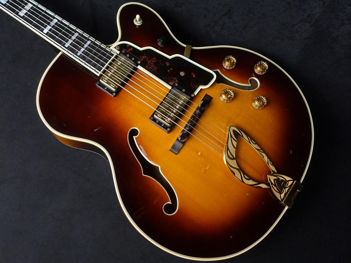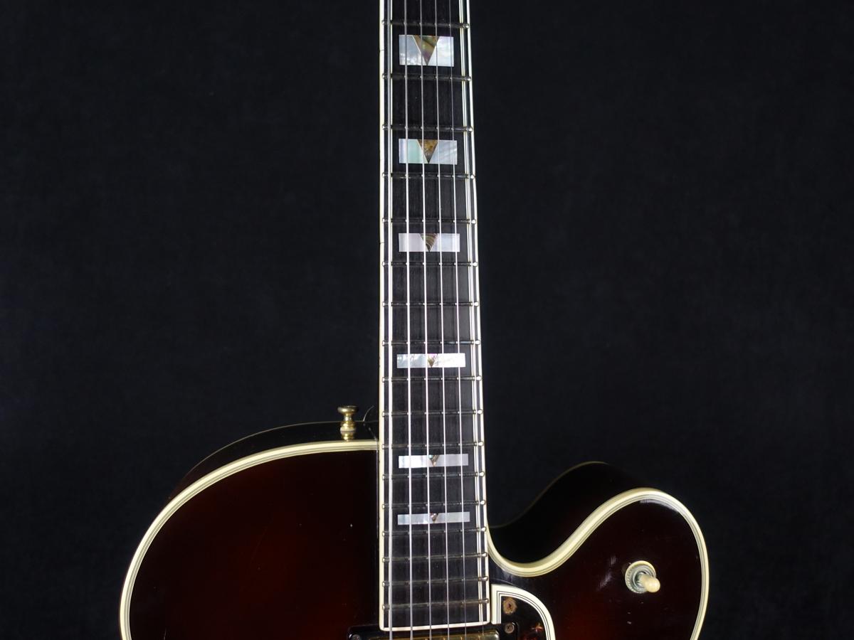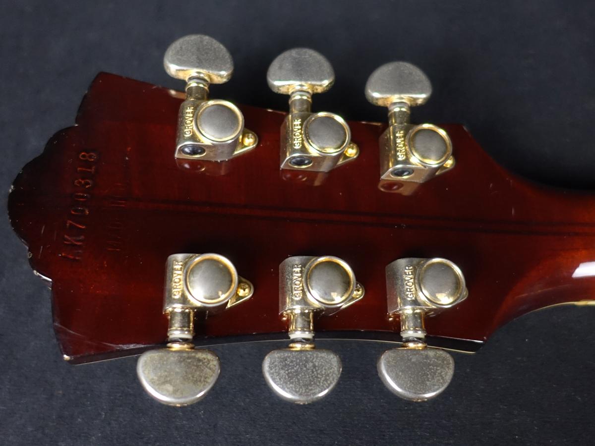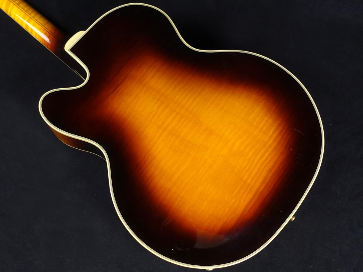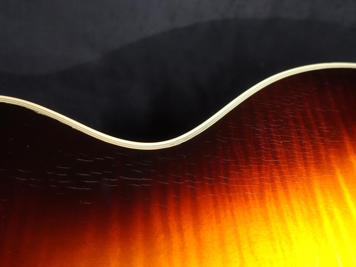 Grover製ペグやハープテイルピース等、ゴールドで統一されたハードウェアやアールデコ調の階段型ピックガードの採用など、パーツ選びに至るまで拘りが垣間見える他、ボディ外周は勿論、指板、ネックヒール部、Fホールの周りにまで施された積層バインディングにより、シックかつラグジュアリーな印象を与えます。