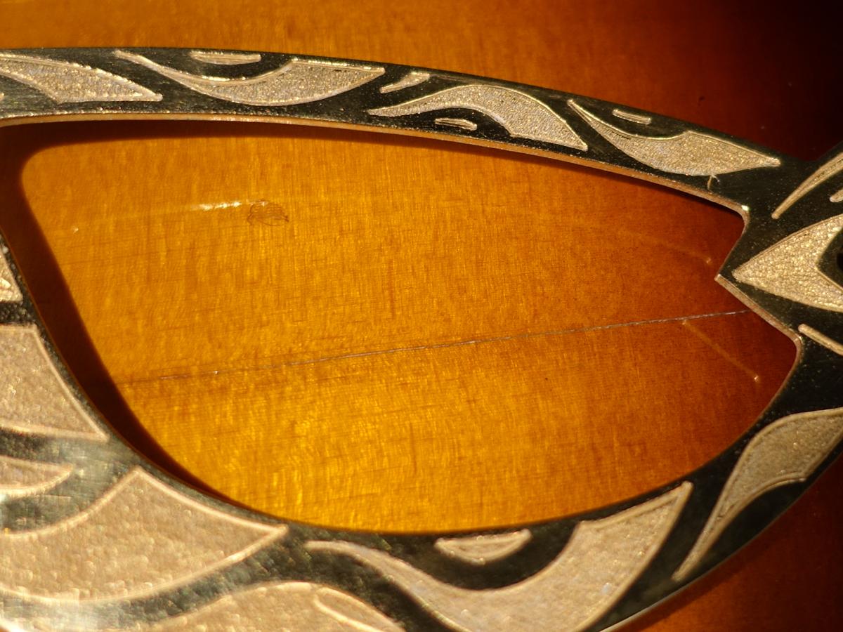 全体的に使用に伴う細かな弾きキズや当てキズ、トップシームの割れや打痕をはじめ、指板サイドの複数箇所に及ぶヒビ割れ、パーツや塗装のくすみ、ウェザーチェックも散見される等、年式相応の使用感があります。