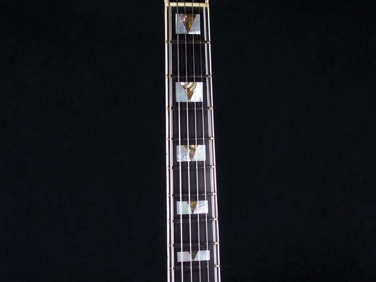 ネックは5Pセレクトフレイムメイプル/マホガニーにVブロックインレイが配されたエボニー指板を採用した上位モデルらしい贅沢なウッドマテリアル。