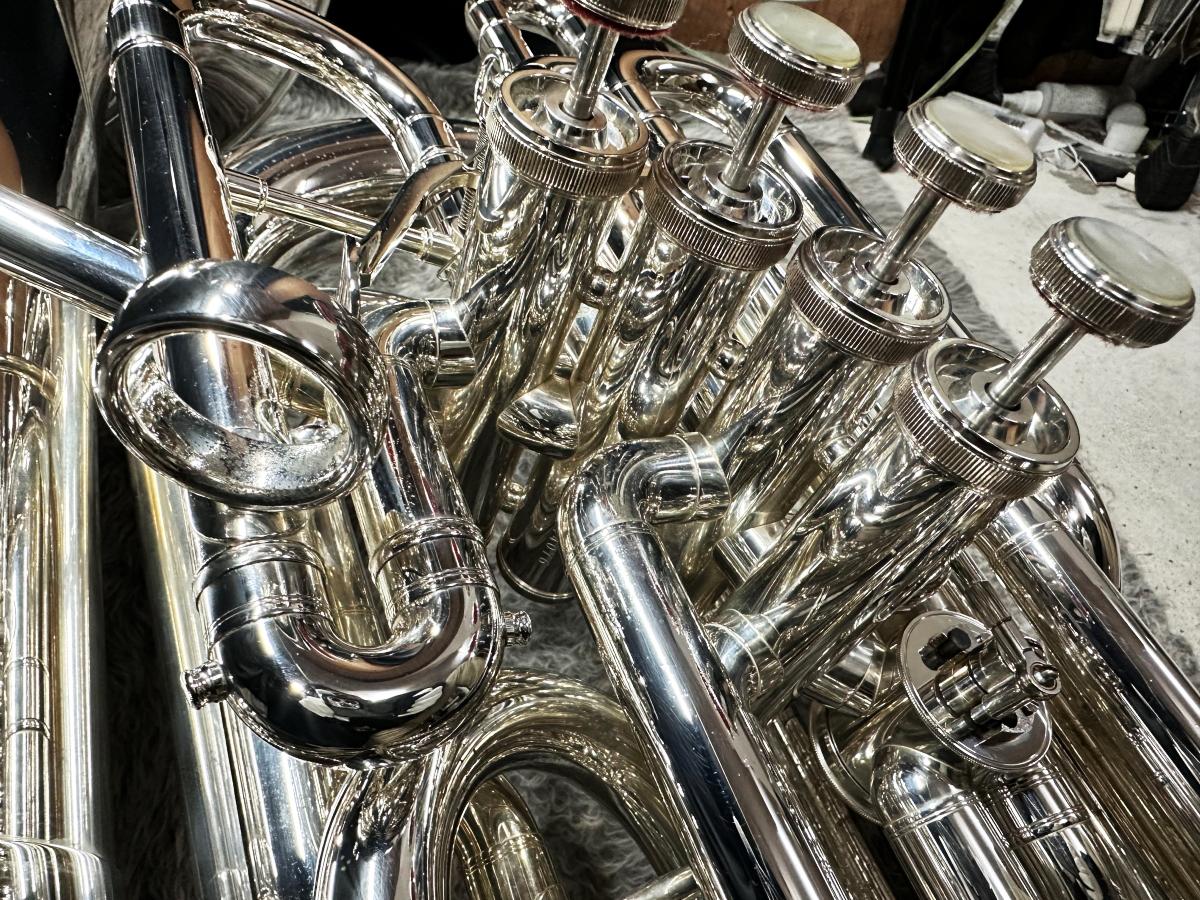 少し使用感のある楽器で、手が当たる部分を中心にメッキの変質やくすみが見られます。