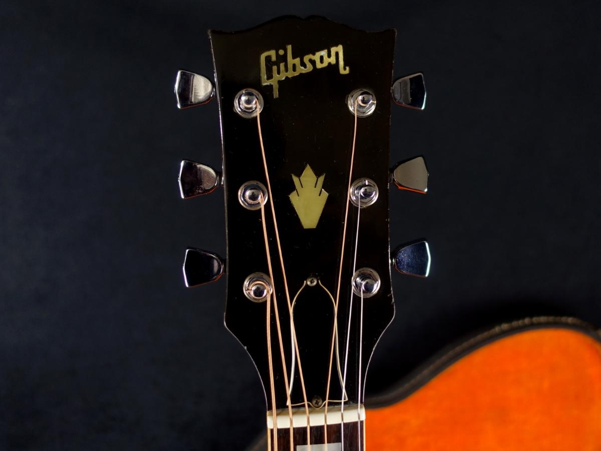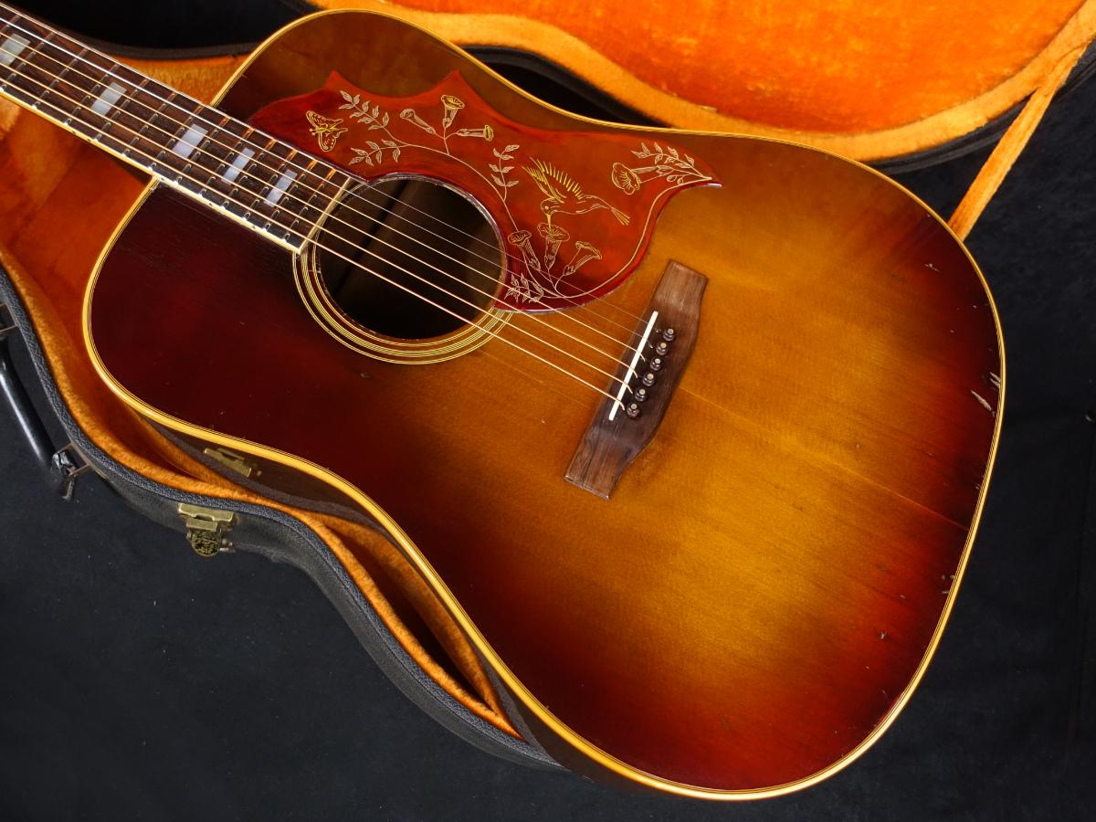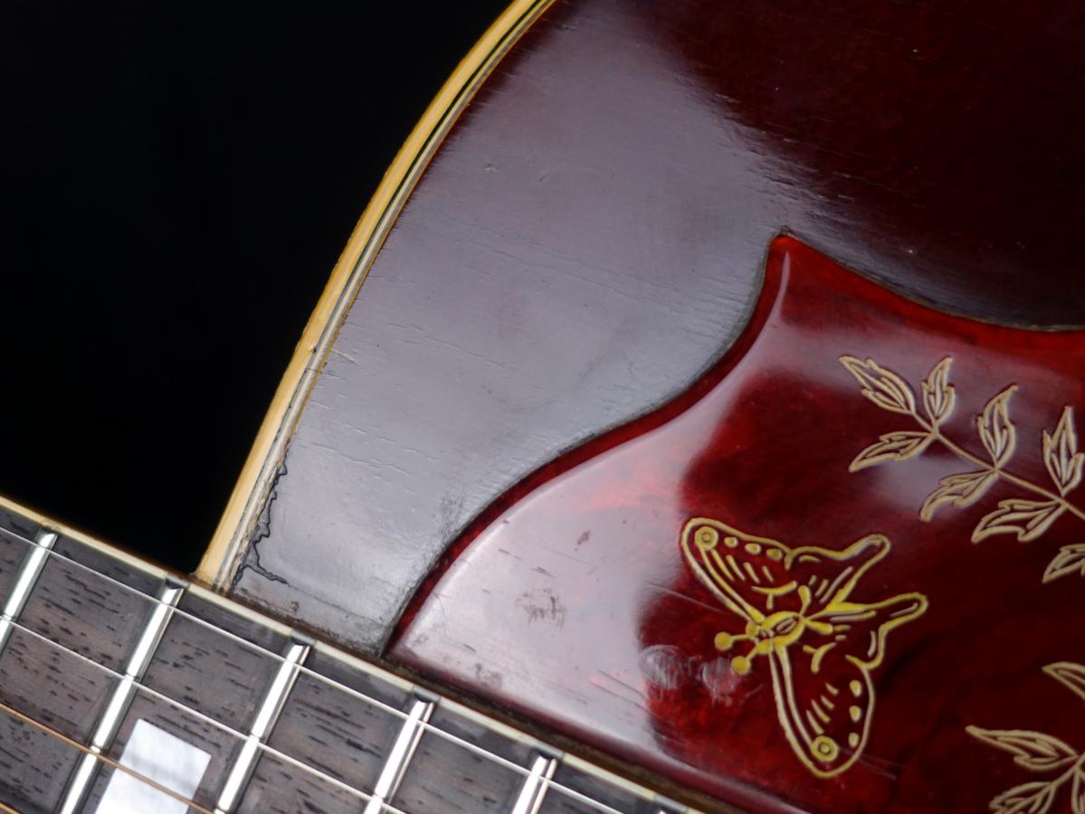 ブリッジサドルはノーマルサドル仕様、金属製のチューリップボタンのGibsonペグ、ハチドリの描かれたピックガード、またこの時期から採用されたダブルXブレイシングが採用。