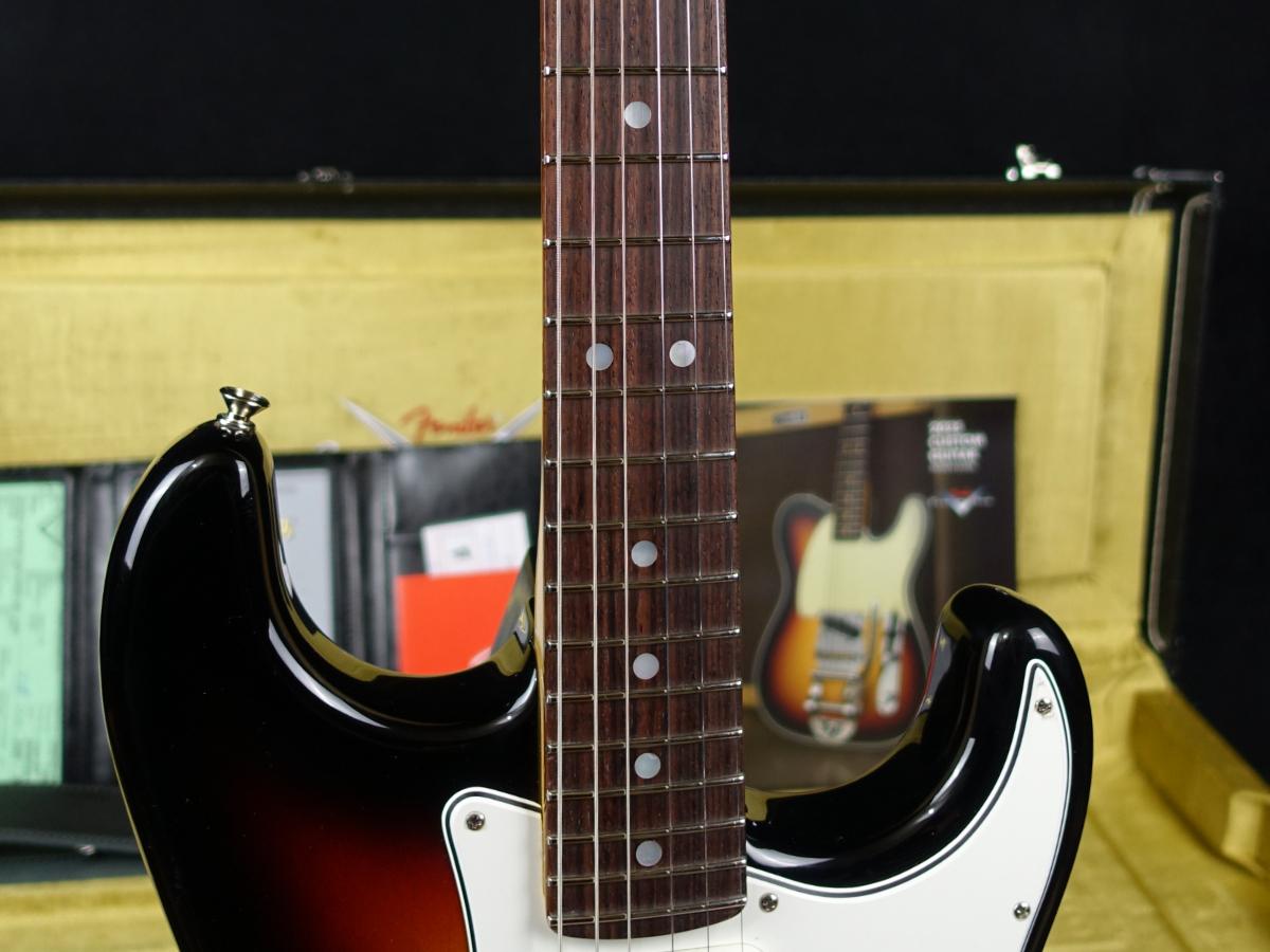 ラージヘッドなど大きな特徴はもちろんのこと、通称Fシリーズのネックプレート、短期間にのみ採用されたトランジションロゴ、パールインレイのドットポジションマーク、また本モデルの最大の特徴でもあるツバ出し22フレット仕様、カスタムショップ製のリイシューモデルではなかなか見ない珍しい仕様のオーダー品となっております。