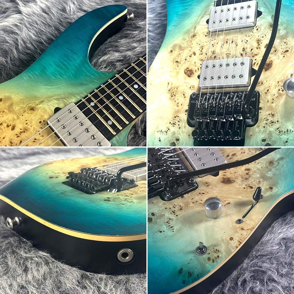 トップに美しいポプラバールを配したバスウッドボディに、メイプル/ウォルナット/パープルハートをラミネートした剛性の高い11ピース構造のネックとエボニー指板をジョイント。