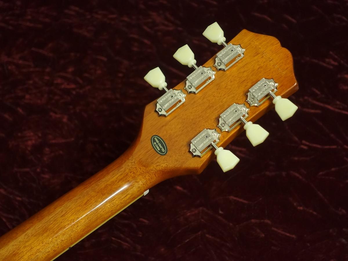 エピフォン・レスポール・スタンダード50sは、グロス仕上げのマホガニー・ボディにメイプルトップの材構成をもち、ロング・ネック・テノン仕様でジョイントされた50sシェイプ・マホガニー・ネック、クラシカルなディッシュ・インレイが施されたインディアン・ローレル指板、新開発のヴィンテージ・デラックス・チューナー、定評のあるエピフォンProBuckerハムバッカー、ダイヤル・ポインタ付きのゴールド・トップハット・ノブなど、充実の仕様群を誇ります。