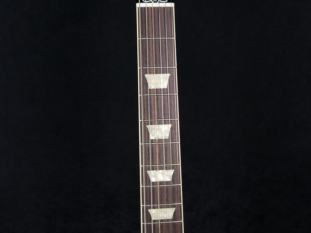レスポール・スタンダード50’sは、ソリッド・マホガニー・ボディとメイプル・トップ、丸みを帯びた50年代のデザインによるマホガニー・ネック、ローズウッド指板、ディッシュ・インレイ、
