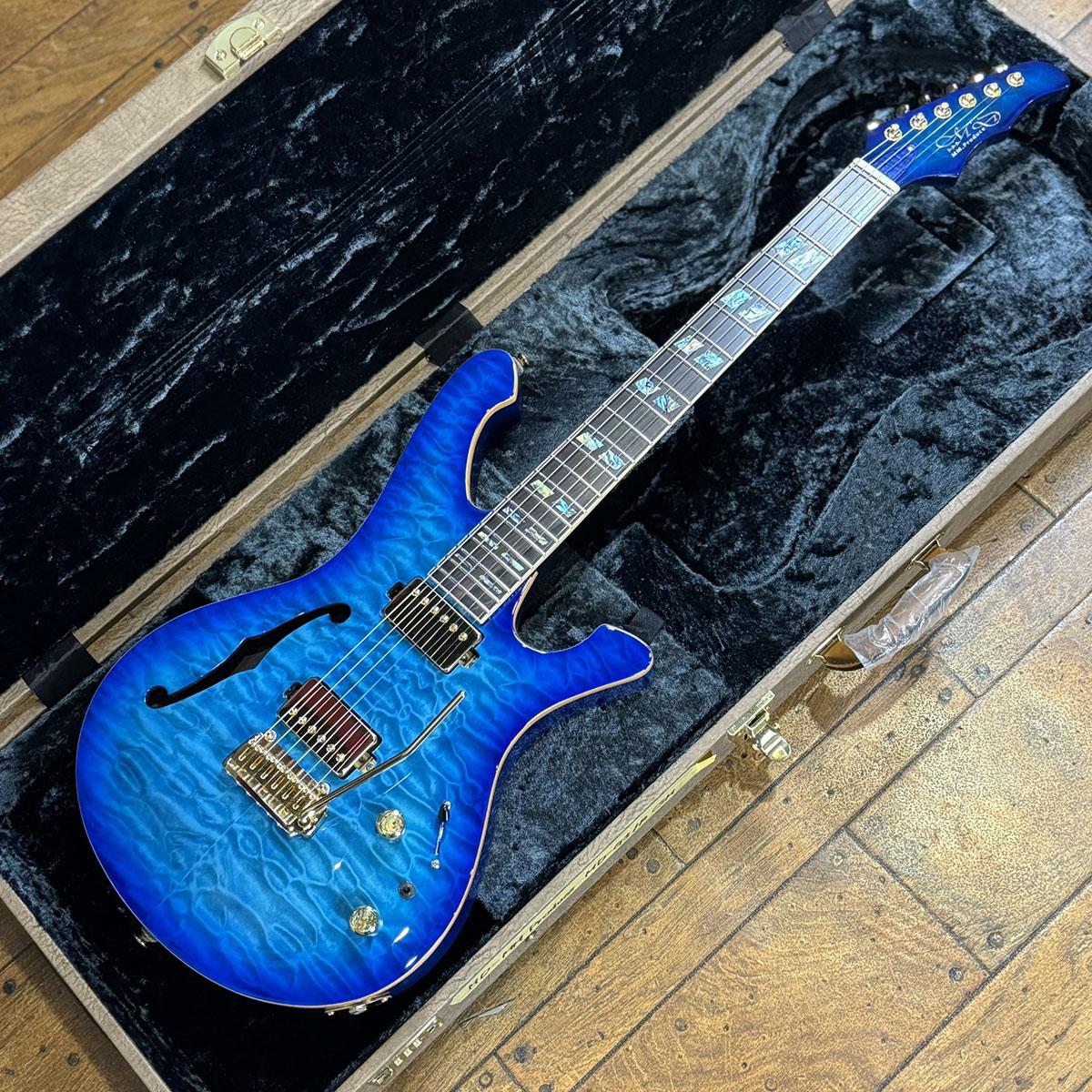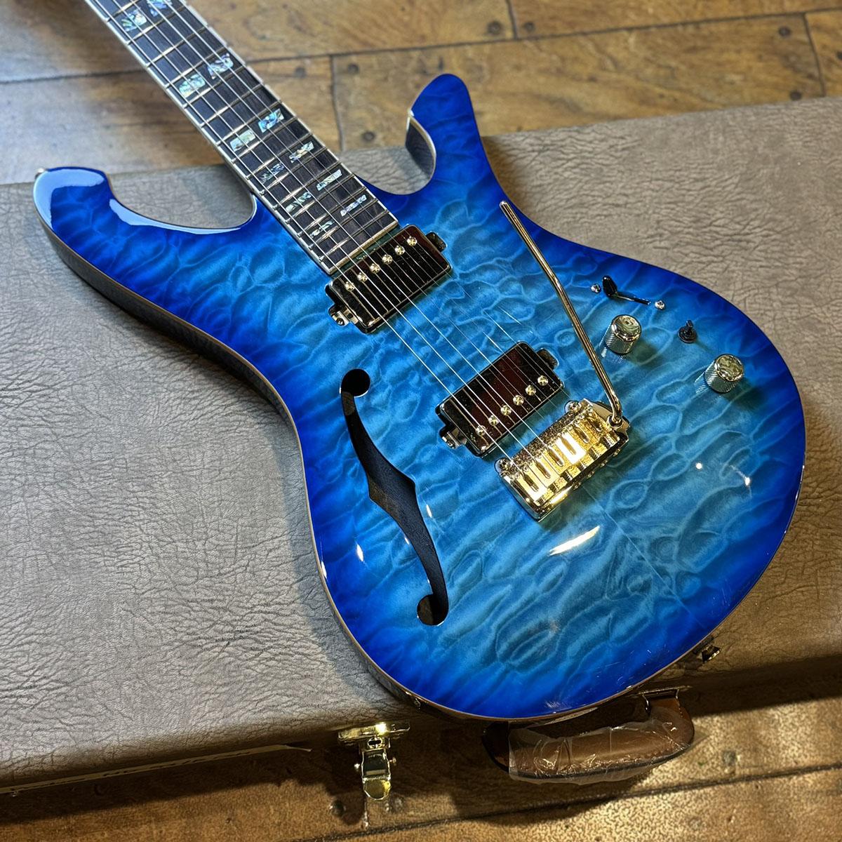 ボディトップには美しいキルトメイプルがあしらわれており、マホガニーバックのボディにマホガニー/メイプル/マホガニー3ピースのネックをジョイント。