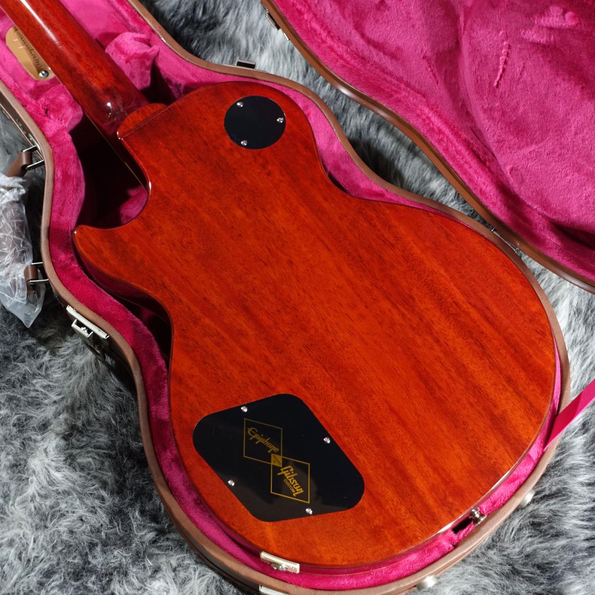本モデルでは、ワンピース・マホガニー・ネック(ロング・ネック・テノン仕様)を採用し、豊かなサステインを実現。1959年ラウンデッド・ミディアムCネック・プロファイルを採用し、バインディングが施されたローズウッド指板を備えています。さらに、マザー・オブ・パールのトラペゾイド・インレイ、エイジド加工を施したEpiphoneロゴ、シルクスクリーン印刷されたゴールド色の「Les Paul Model」の文字が入ったギブソン・スタイルの“オープンブック”ヘッドストックを採用。サイドドットの位置やサイズも、1959年当時のLes Paul Standardと同じ仕様になっています。ジェニューイン・マホガニー材のボディにメイプル・トップが貼られ、トップには美しいAAAフレイムメイプル化粧板があしらわれています。