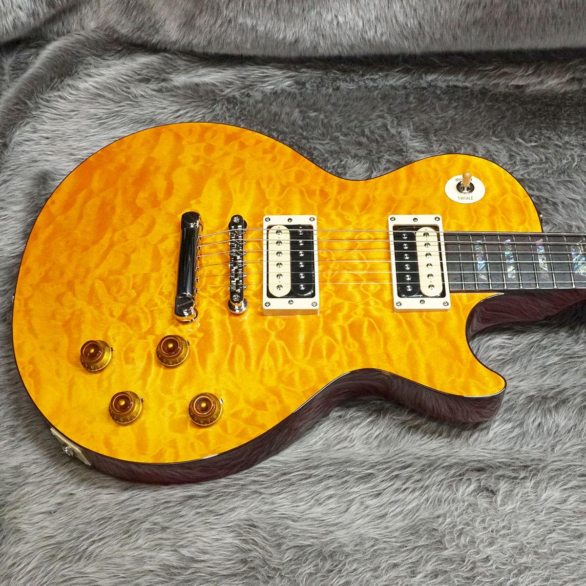 メイプルトップにチェンバー加工が施された2Pマホガニーバック、スリムなグリップシェイプの1Pマホガニーネック、ローズウッド指板という定番スペックをベースに、ゴージャスなキルトメイプルをあしらったウッドマテリアル。