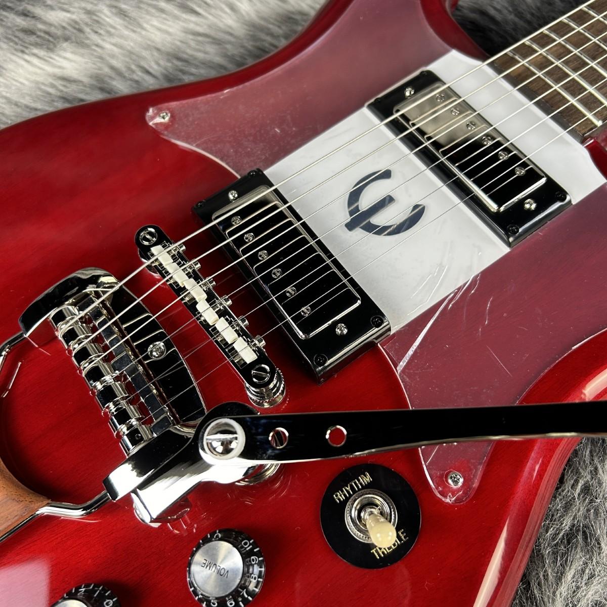 当時、クレストウッドはエピフォン初のオリジナル・ソリッドボディ・エレクトリックギター・デザインとしてギタリストに認知されていました。 この度リリースされたEpiphone Crestwood Customは、初期モデルを彷彿とさせるデザインが秀逸です。2基のエピフォン PRO Mini Humbucker™ ピックアップを搭載した左右対称のダブルカッタウェイ・ボディ、片側3連でチューナーが配置されたカラマズー・ヘッドストック、ヘッドストック上に配されたエピフォン・ビキニバッジとアイボリー色のつまみを持つエピフォン・デラックス・チューニングマシン、そしてホイル素材のEロゴが貼られたバタフライ・ピックガードなど、充実した仕様が満載です。 ミディアムCシェイプのネック・プロファイルをもつネックが接合され、インディアン・ローレル材による12インチRの指板、22フレットのミディアムジャンボフレットと楕円形の指板インレイ、CTSポテンショミーターによる2ボリューム/ 2トーンのコントロール、そしてEpiphone LockTone™チューン・オー・マチック・ブリッジとグラフテック® TUSQ®サドル、トレムトーン・ヴィブラート・テイルピースなど、充実の仕様群を誇ります。