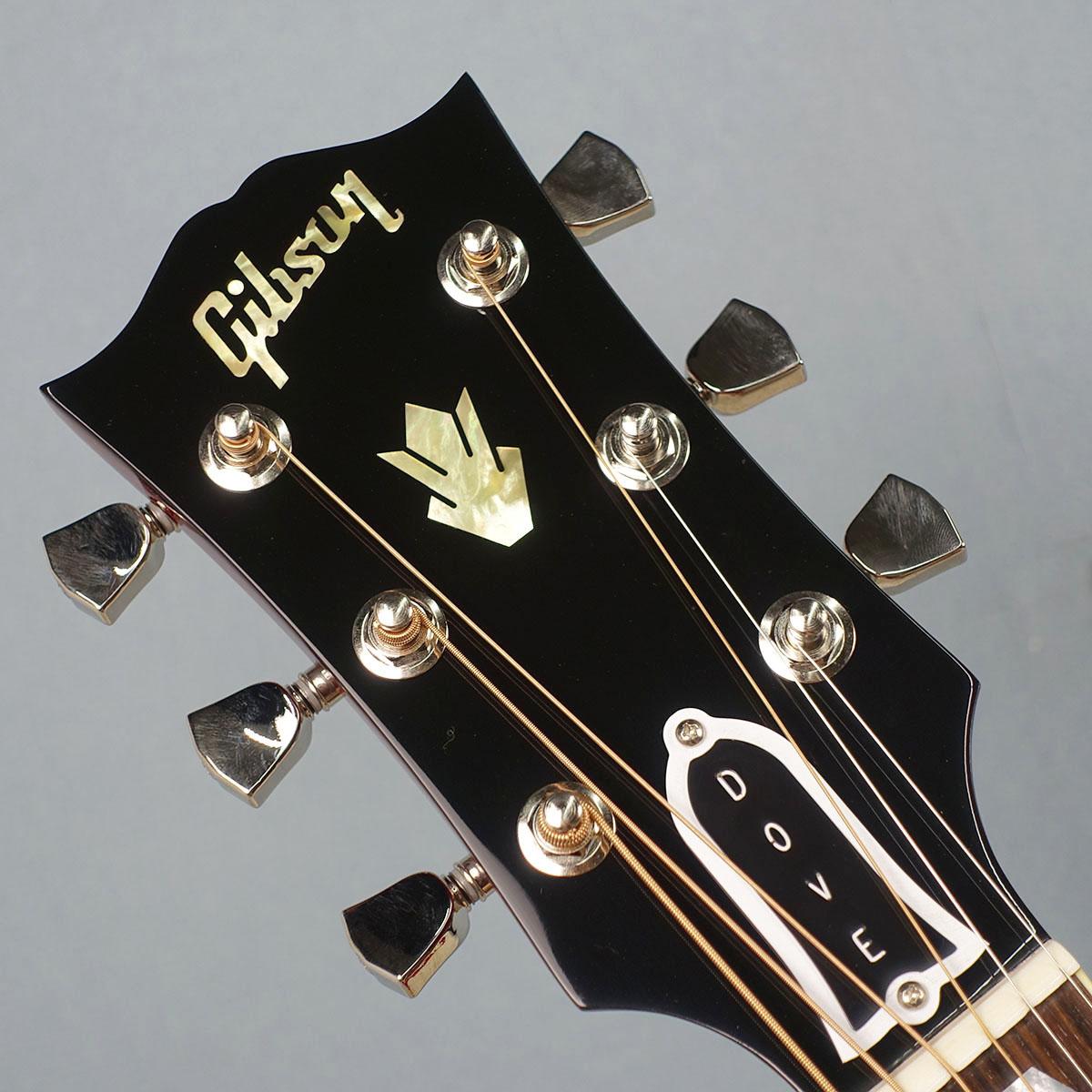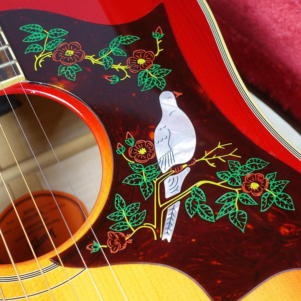 クラシックな仕様を擁するDoveの仕様詳細として、ボーンナット、ボーンサドル、ダブル・アンティーク処理で渋みを増した多層バインディング、二ッケル・グローヴァー・キーストン・チューナー、伝統的なダヴ・トラスロッド・カヴァー、そしてマザー・オブ・パールによる鳩のインレイと手彫りと手作業でペイント作業が施された手の込んだピックガードなどが挙げられます。