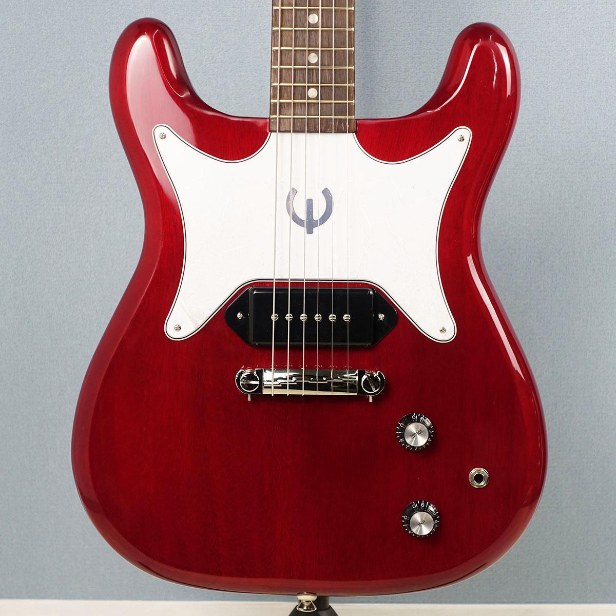 1基のPRO P-90ドッグイヤー・ピックアップを搭載した左右対称のダブルカッタウェイ・ボディ、片側3連でチューナーが配置されたカラマズー・ヘッドストック、ヘッドストック上に配されたエピフォン・ビキニバッジとアイボリー色のつまみを持つチューニングマシン、そしてホイル素材のEロゴが貼られたホワイト・バタフライ・ピックガードなど、充実した仕様が満載です。