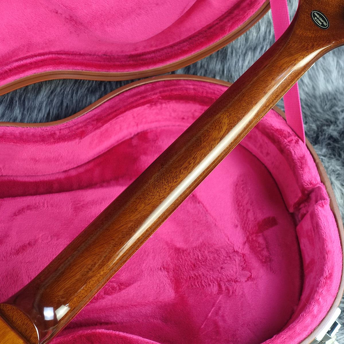 外張りがブラウン色で内張りがピンク色のヴィンテージスタイルのハードケースが付属します。