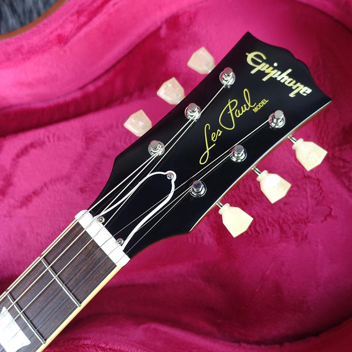 ネックにはワンピースマホガニーを使用し、50年代スタイルのラウンドミディアムCプロファイルとロングネックテノンを採用。安定した演奏性と豊かなサステインを実現します。バインディングを施したローズウッド指板にはマザーオブパールのトラペゾイドインレイを備え、22本のミディアムジャンボフレットを搭載。ギブソンと同様のオープンブック型ヘッドストックには、エイジド加工を施したマザーオブパールのEpiphoneロゴと、シルクスクリーン印刷されたゴールド色の「Les Paul Model」の文字が入ります。さらに、サイドドットの位置やサイズまで1957年当時のLes Paul Standardと同様に設計されています。