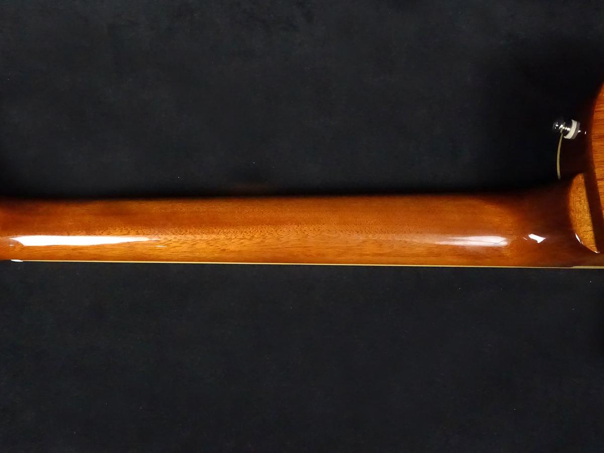 ロング・ネック・テノン仕様でジョイントされた50sシェイプ・マホガニー・ネック、クラシカルなディッシュ・インレイが施されたインディアン・ローレル指板。