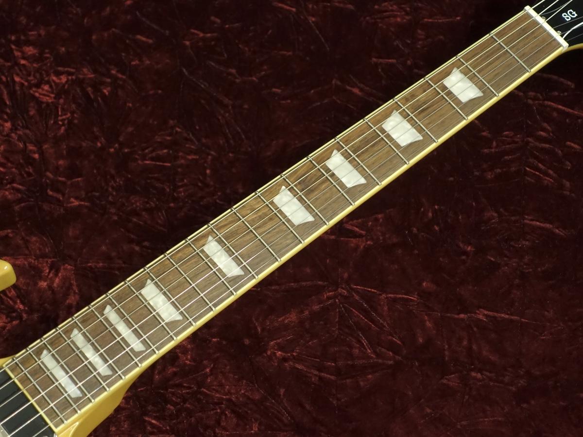 SGスタンダードはプレイヤーにフィットするコンター加工付きのボディ形状を持ち、ダブル・カッタウェイにより22フレット全てのポジションへの容易なアクセスを実現しています。セットネック方式でジョイントされたネックはSGの高いサスティン特性に寄与しています。ネックシェイプはスリム・テーパー Cプロファイルが採用され、素早い滑らかなフィンガリングを可能にしています。ミディアム・ジャンボ・フレットが打たれたローレル指板にはパーロイド素材のディッシュ・インレイが施され、12インチの指板R(ラディアス)採用によりロー・ポジションでのコード・プレイやハイ・ポジションでのベンディングの両方をストレスなく行えます。