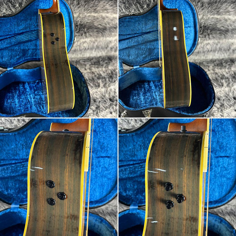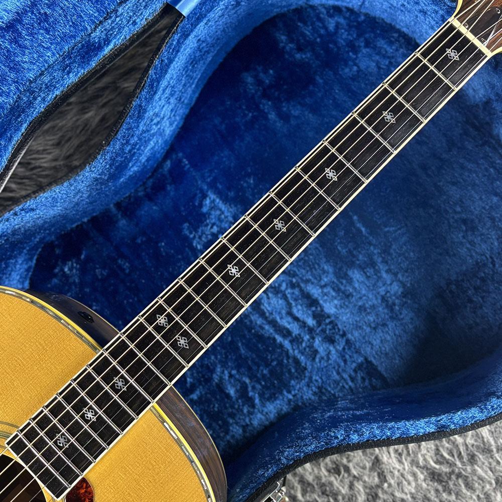 トップにエゾ松、サイド&バック材にはパリサンドルを採用した総単板仕様。指板やブリッジには黒々としたエボニーが使用されています。