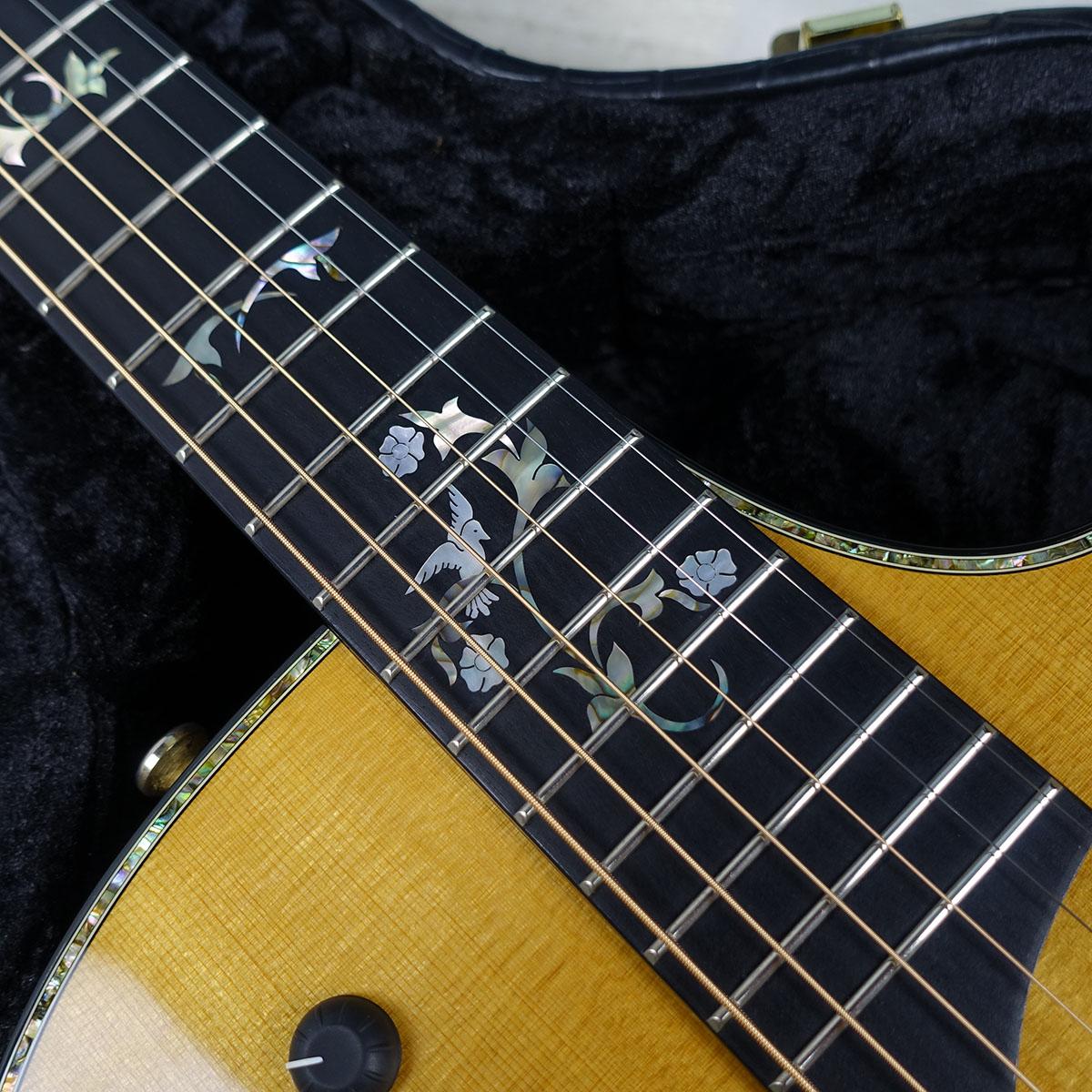 スプルーストップ、サペリバックは定番かと思います。パーフリングにアバロンが使われ派手すぎない高級感を感じる仕様です。指板のデザインインレイが施されこちらもアバロンを使用。