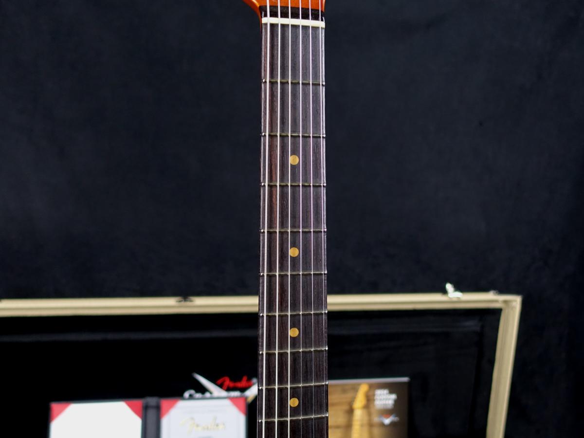 1960仕様では珍しいアッシュボディ材、ネックにはクオーターソーン・メイプルネック、スラブ貼りのローズウッド指板を採用、また指板サイドの指板エッジロールオフ加工が施されており、シェイクハンドした時に角が気にならずストレスなく握り込めます。
