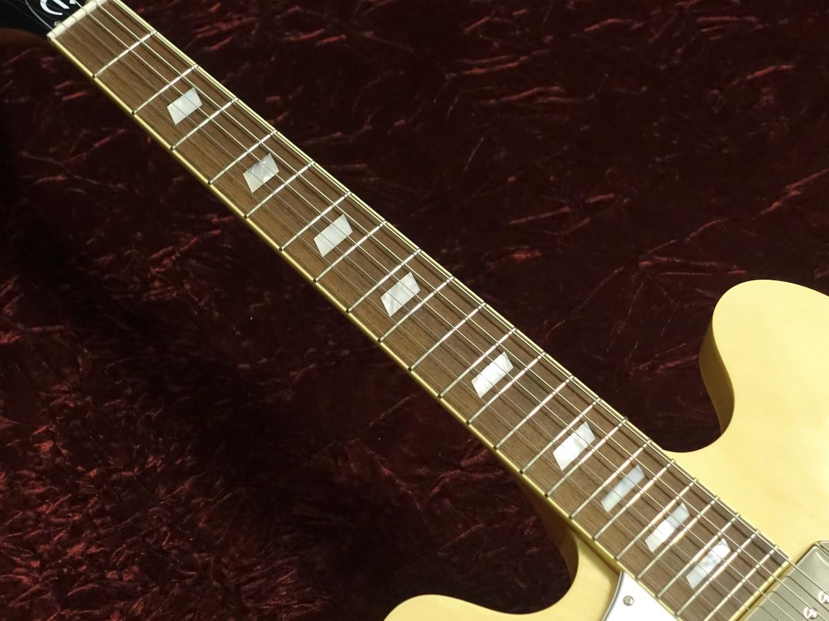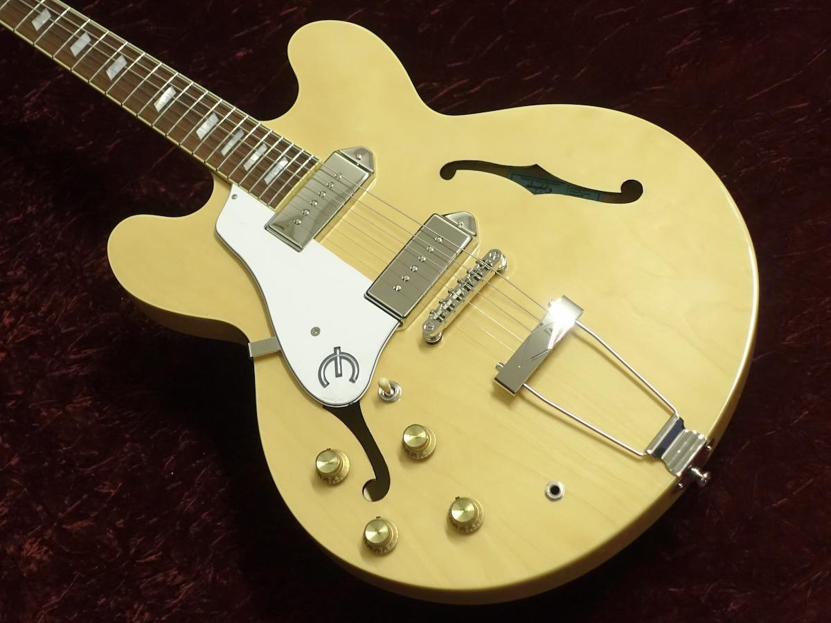 ラミネイトメイプルのホロウボディに、16フレットジョイントのマホガニーネック&パ―フェロー指板、手軽に取り外しが出来るLock Tone Tone-O-Maticブリッジ、通称””ブランコテールピース”と呼ばれるボディエンドから伸びたトラピーズテイルピース、ピックアップはドッグイヤータイプのEpiphone P-90シングルコイル×2を搭載。