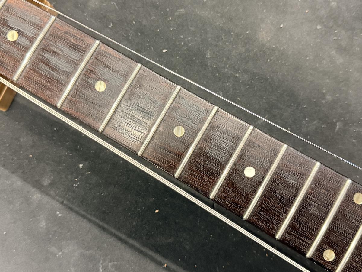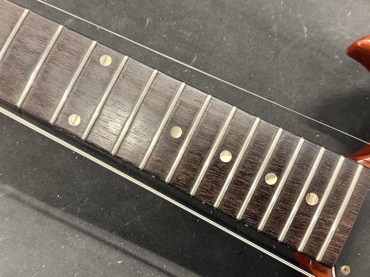 フレットはローポジションを中心に減りや凹みがございますが、適正な弦高でビビりや音詰まりはございません。
