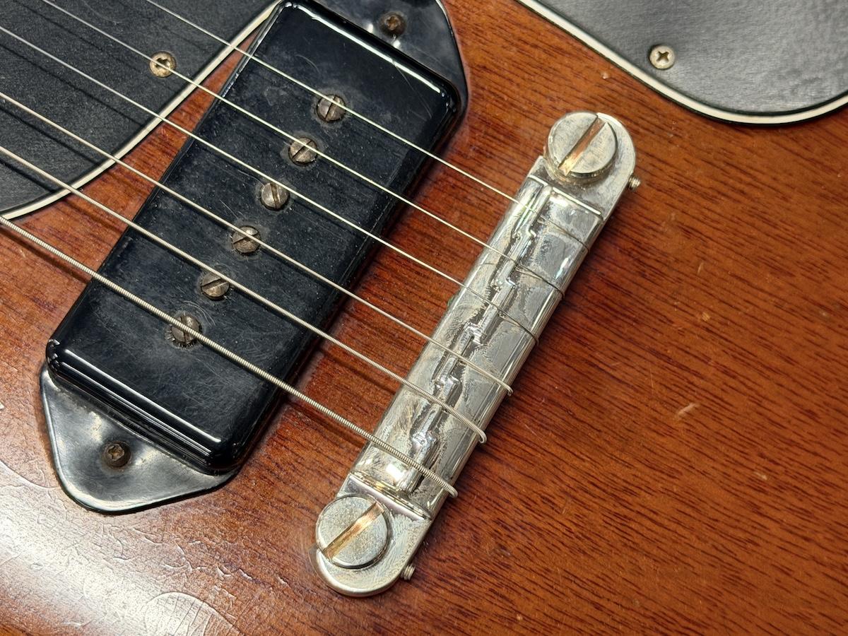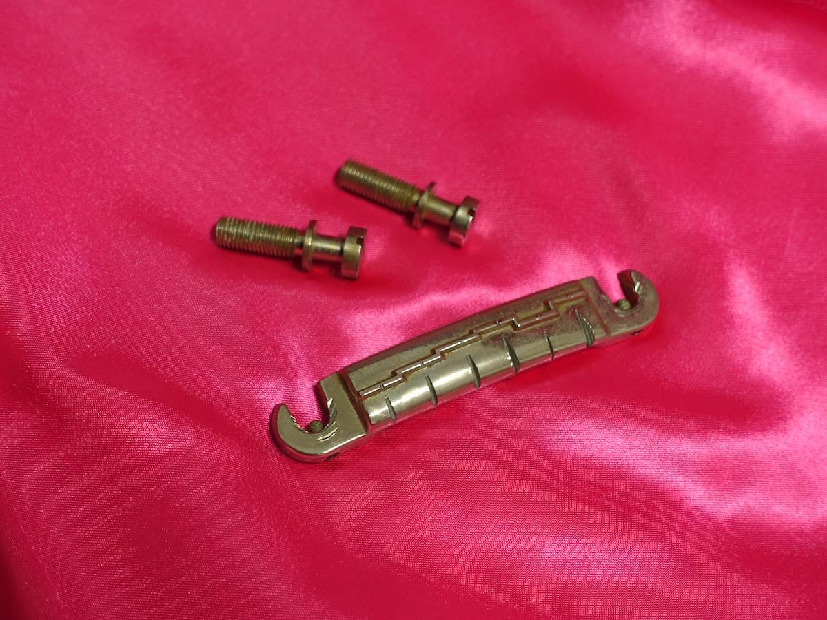 確認できる交換箇所としては、ブリッジが現行品のライトニングブリッジへ交換されており、スタッドがトーンプロスのロッキングスタッド(おそらくSS1-Gと思われます)へ換装されていますが、どちらもオリジナルパーツが付属致します。(オリジナルのライトニングブリッジは改造されています)