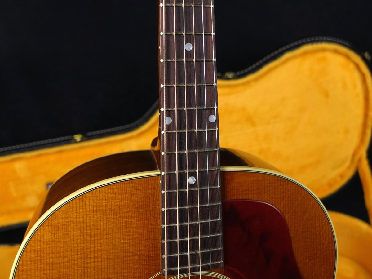 ローズウッド指板には20本のラージサイズのレジェンド・フレットが打たれ、マザーオブパールのドットインレイが施されています。