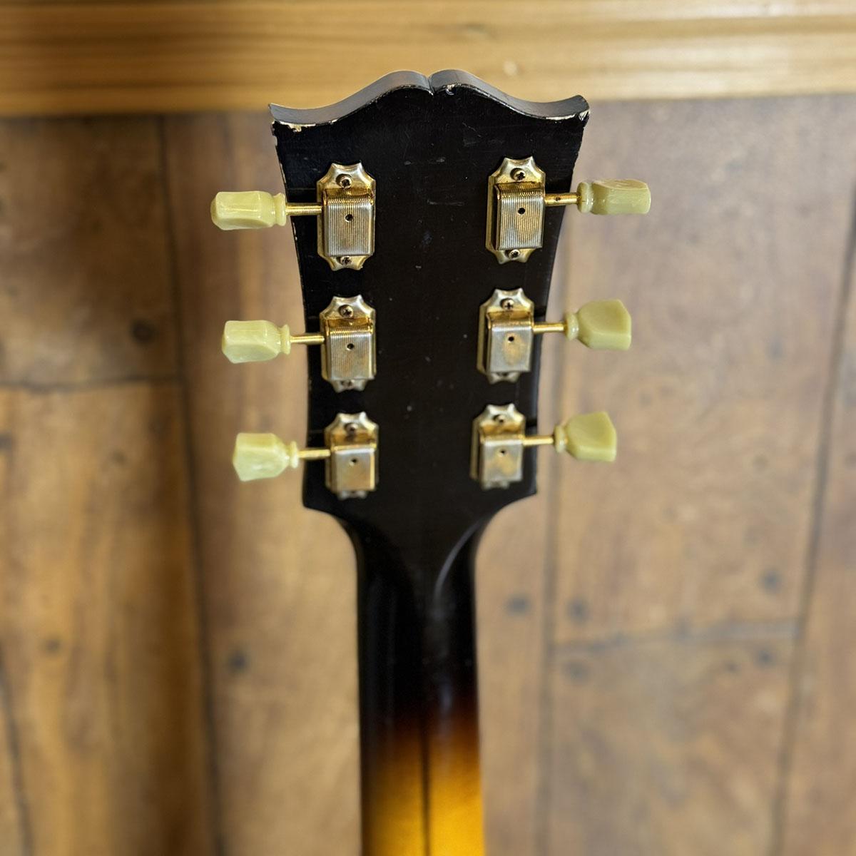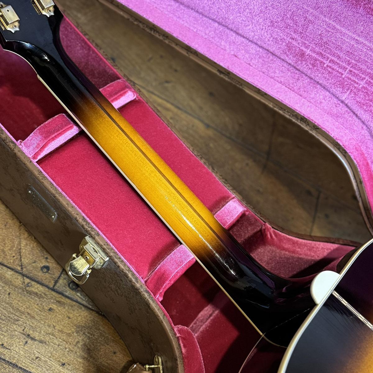 とりわけSJ-200には華やかなフレイム・メイプルがサイド、バック材として使用される印象がありますが、当器はそれほど華美でなく、お淑やかでありながらもダイナミックで存在感のある杢のフレイム・メイプル材が使用されており、これは1957年当時のSJ-200も概ね似たような外観の個体がよく見られることに所以していると思われ、ギブソン・カスタムショップの徹底したギター作りに対する姿勢が垣間見える意匠であると感じます。