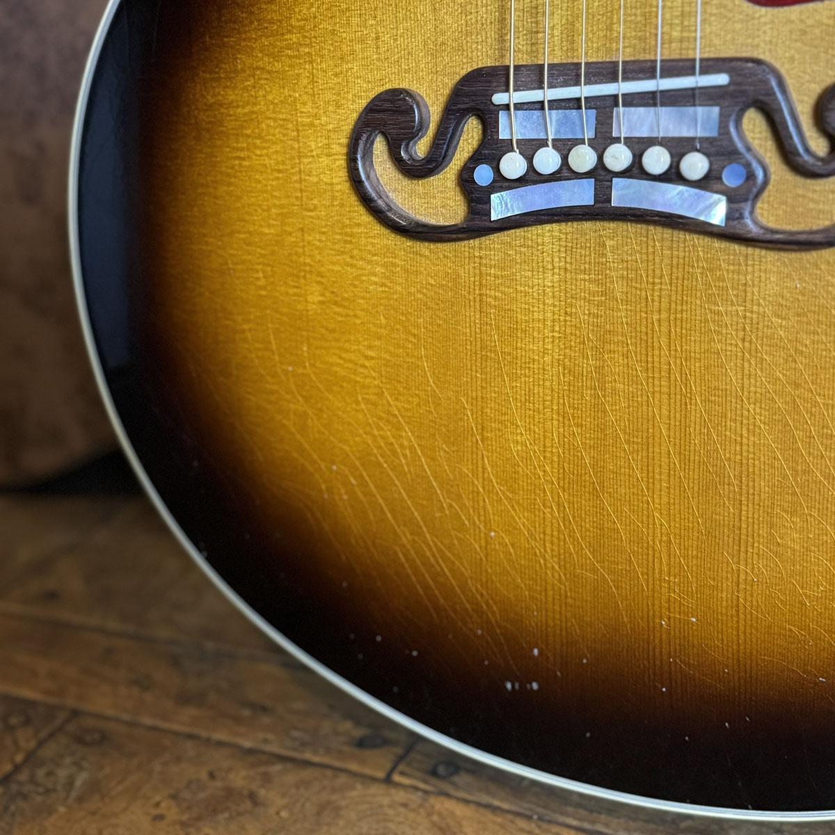 ライトエイジドと称されたエイジングは、経年により全体にビッシリと入ったウェザーチェックや、細やかな打痕、サウンドホール周りの弾き傷など数十年にわたりギタリスト達に演奏され続けてきたヴィンテージギターの風合いを再現しています。
