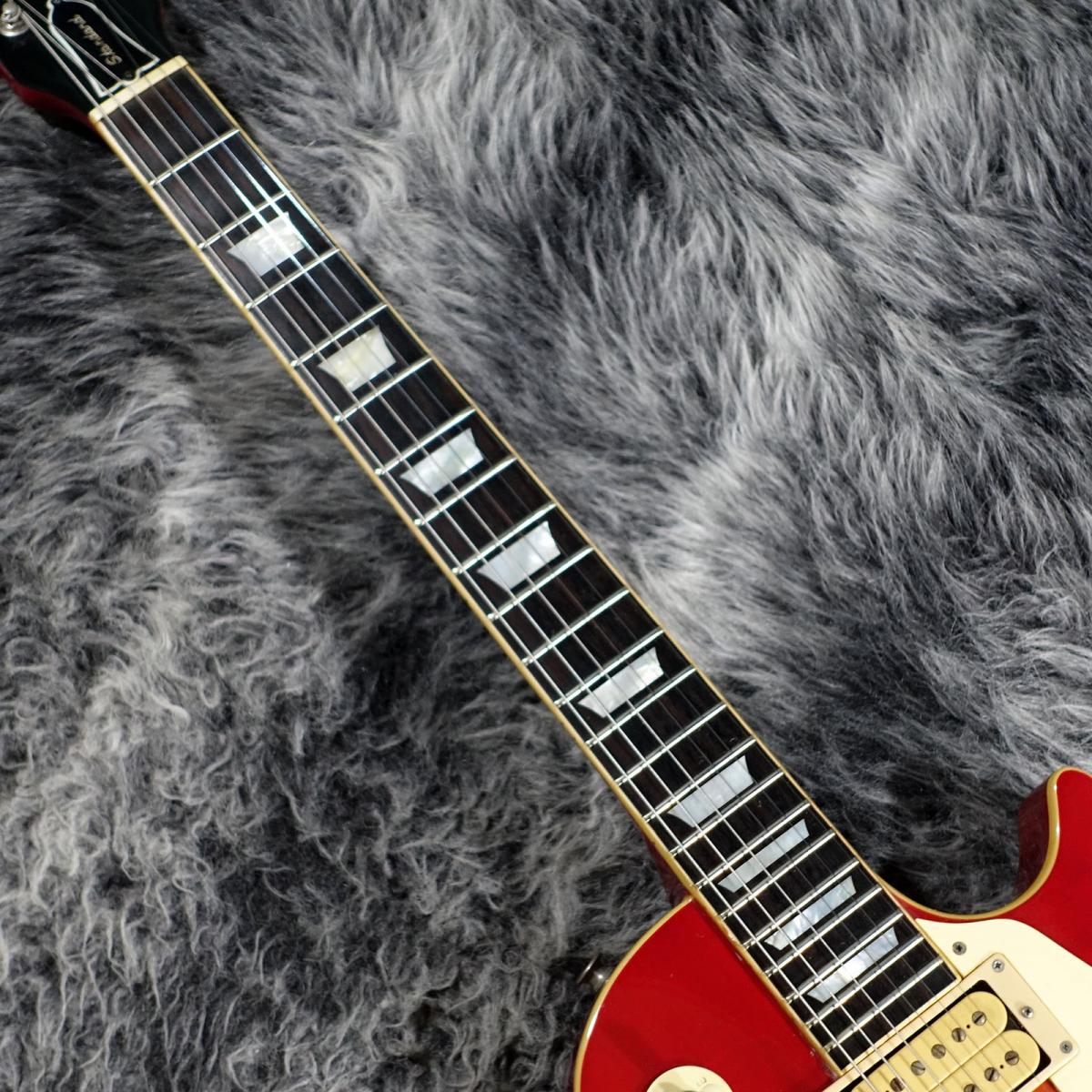 人気の国産レスポールモデル、弾き傷や当て傷など年代なりにダメージが見られ、バック面のステッカーの箇所にピン穴と塗装クラックが生じております。