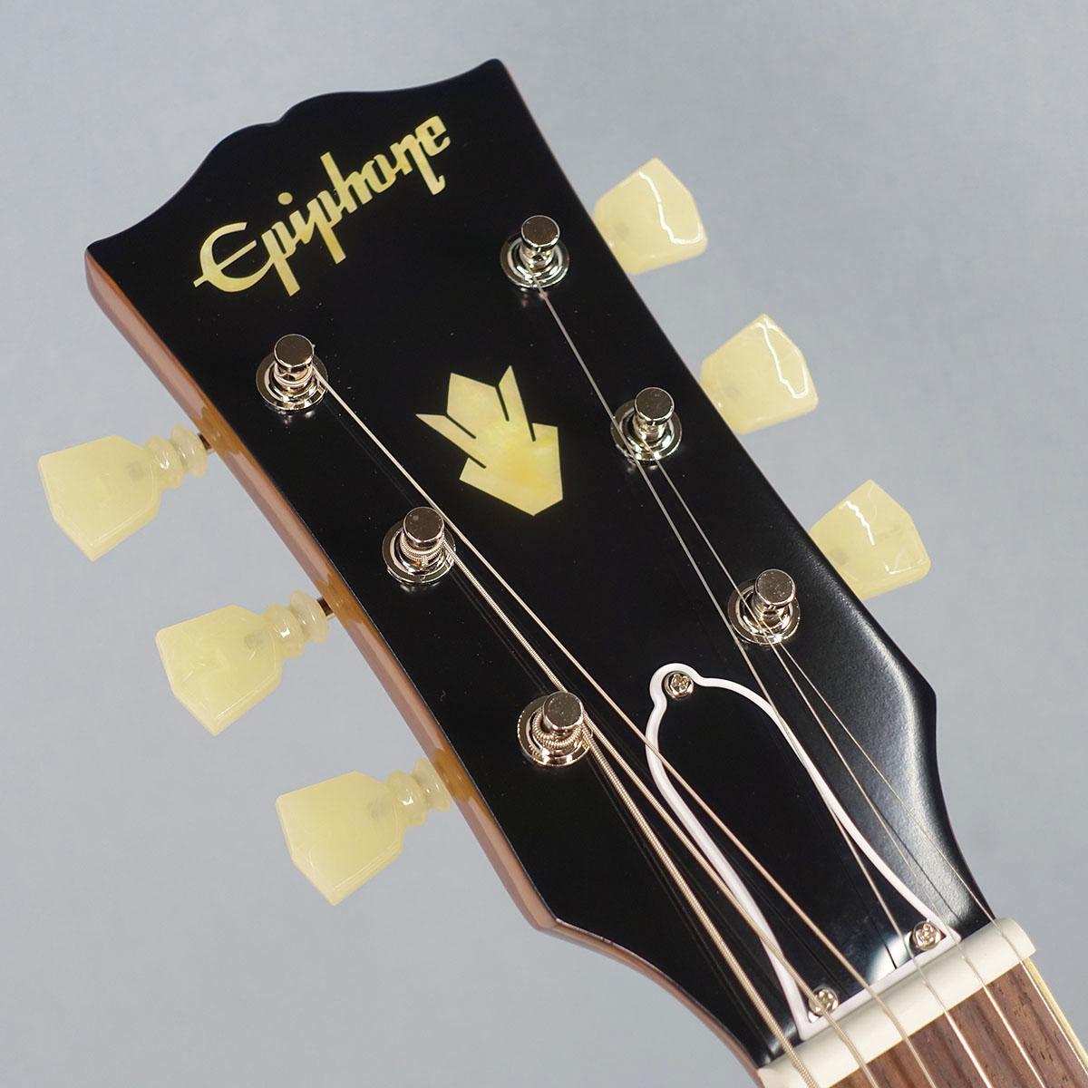 ヘッドストックにはGibsonスタイルの“オープンブック”デザインを採用し、EpiphoneロゴとGibsonクラウン・インレイをエイジド・マザー・オブ・パールで装飾。