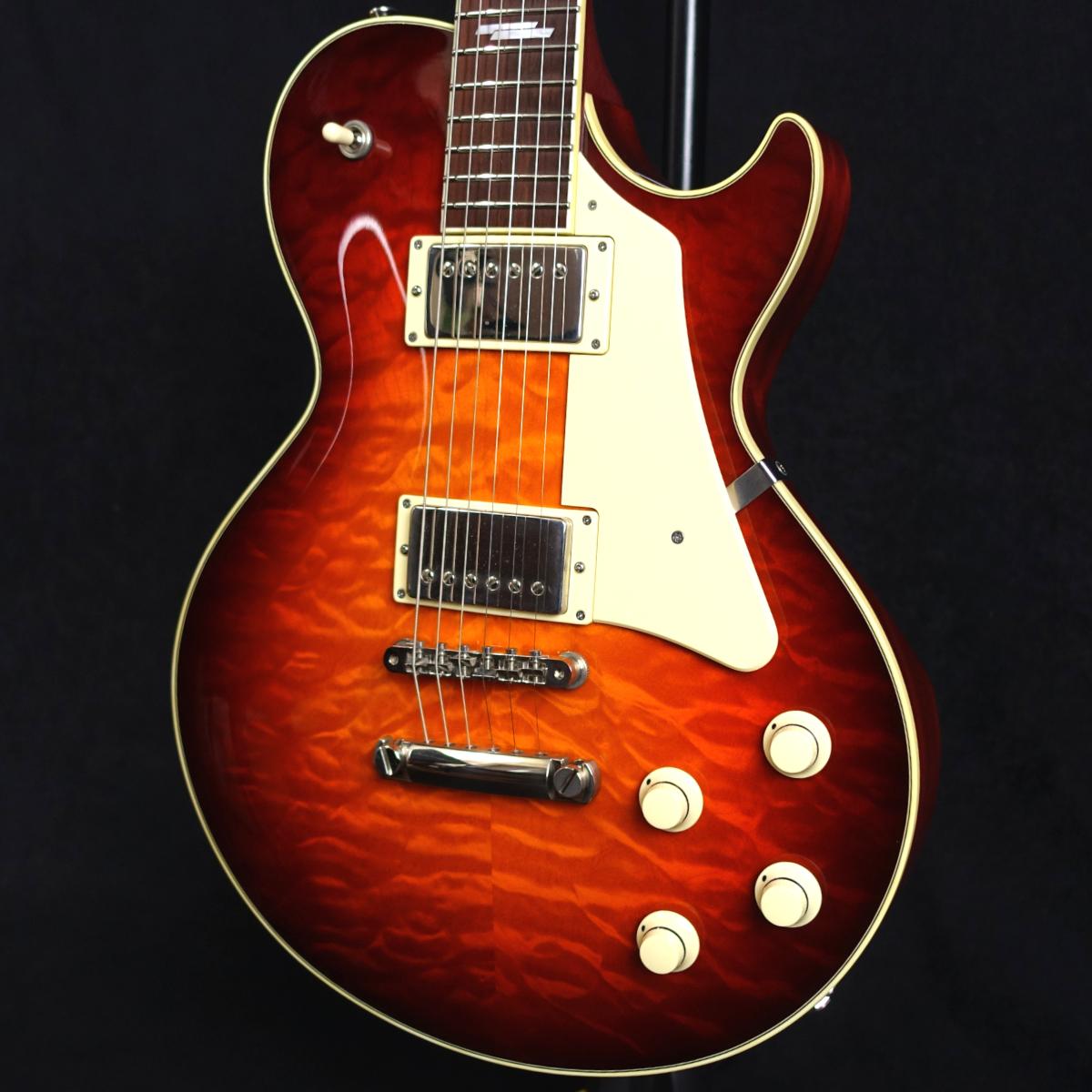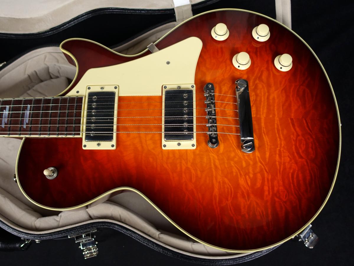 独自のパラレログラム・インレイ仕様、杢目のアイボロイドバインディング、ペグヘッド、カスタムメイドのアイボロイドトップハットノブ、トラスロッドカバーなど独自の特別な仕様が所狭しと散りばめられております。