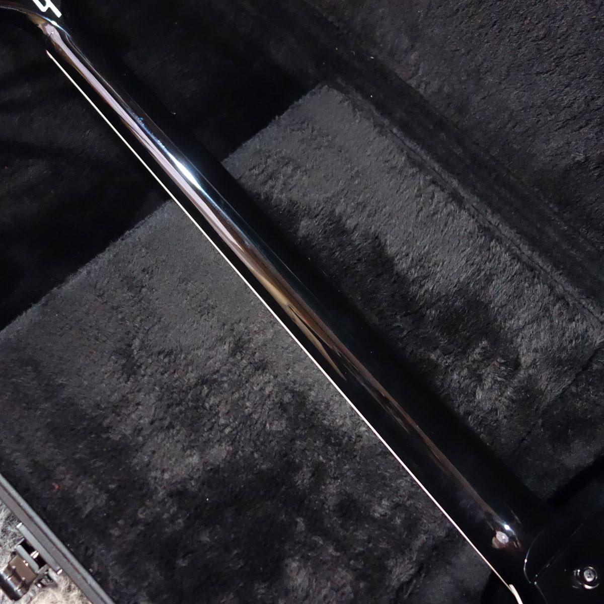 バインディングが施されたネックにエボニー指板、インレイにはパーロイド・リバース・スプリット・ダイアモンドを採用しています。